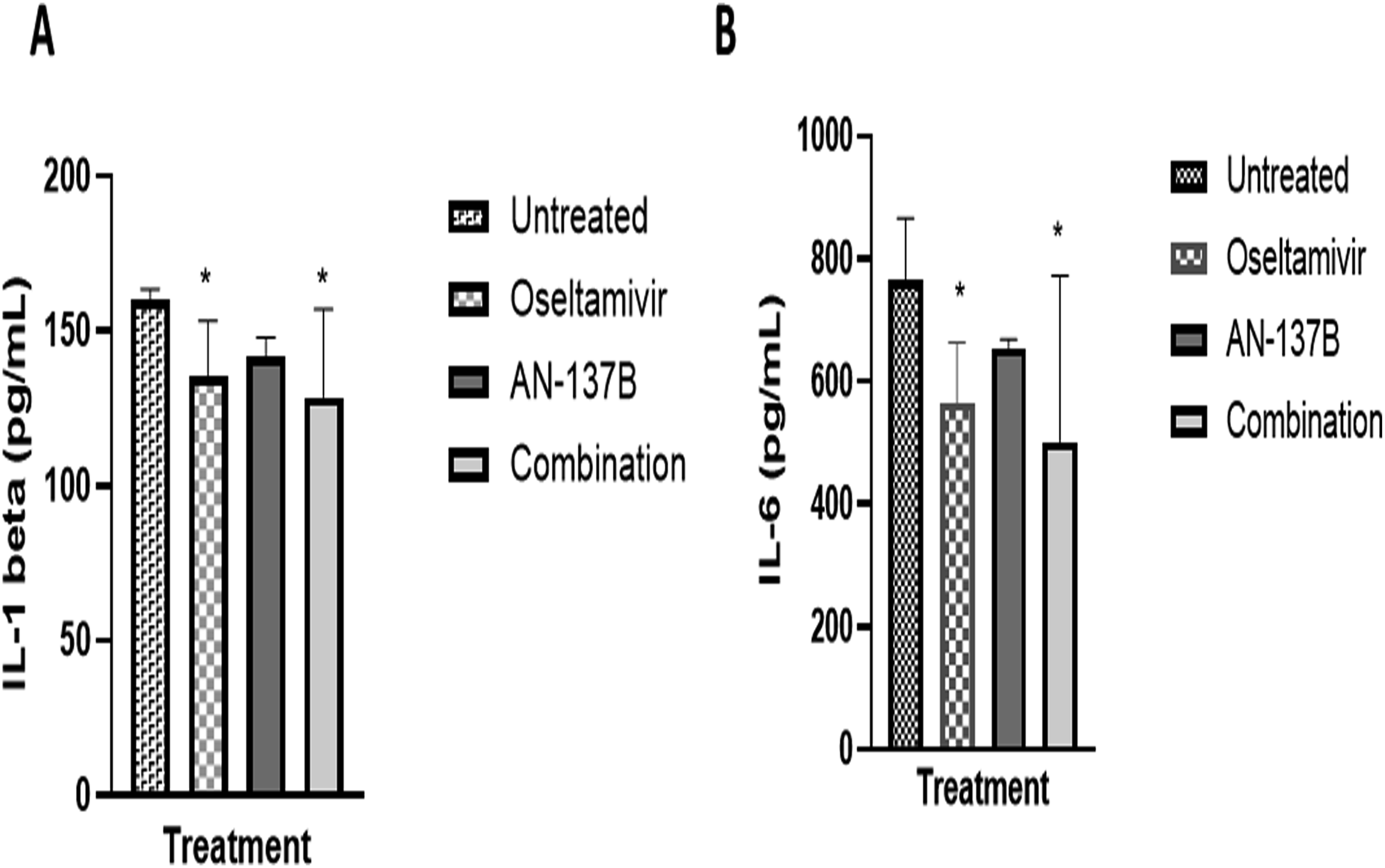 Levels of the pro-inflammatory cytokine IL-1β in lung samples were significantly lower in the groups that received oseltamivir alone or oseltamivir in combination with AN-137B, compared to the untreated group (135.40 ± 17.92 pg/mL, 128.55 ± 28.55 pg/mL and 160.42 ± 3.12 pg/mL, respectively) while IL-1β levels of the AN-137B group were not significantly reduced compared to the untreated group (141.65 ± 6.24 pg/mL (Figure 4(A)). A similar pattern was observed regarding IL-6 lung levels, that is, 565.00 ± 99.08 pg/mL, 501.20 pg/mL, 654.57 ± 13.98 pg/mL and 763.85 ± 102.35 pg/mL for the groups that received oseltamivir, oseltamivir + AN-137B, 137B and no treatment, respectively (Figure 4(A)). Cytokine levels in mouse lungs. Levels of IL-1-β (a) and IL-6 (b) were determined in lung homogenates of mice infected intranasally with 200 PFUs of influenza A/Puerto Rico/8/1934 (H1N1) virus by ELISA. Results are expressed as the mean of protein concentration in pg/mL ± standard deviation of 4 mice per group from two independent experiments. *,