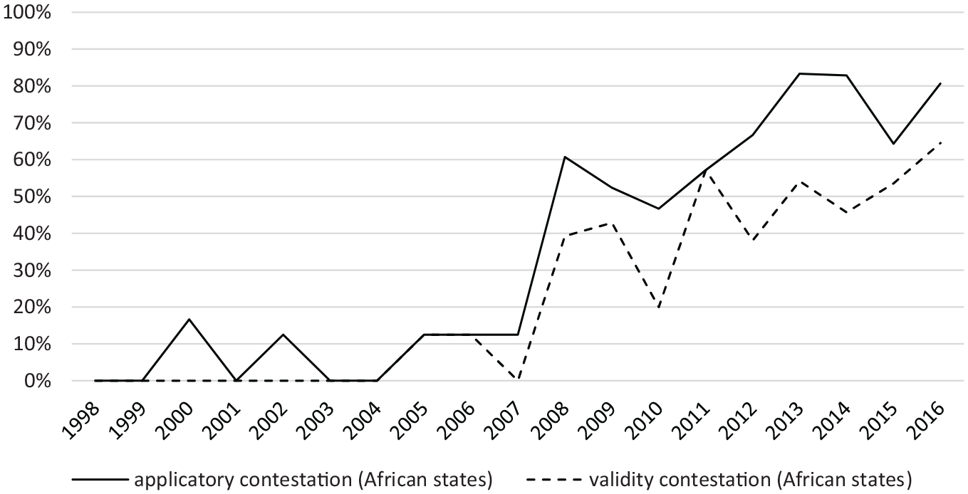 Share of statements containing applicatory and validity contestation, African states and the AU, 1998–2016.
