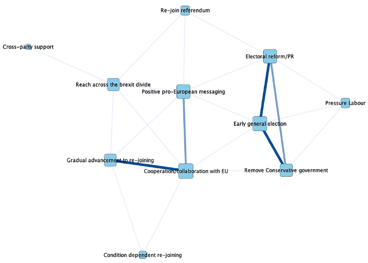 Finally, direct analysis of the connections between framing components reveals that, despite a developed and well-balanced economic frame that points to the Conservative party as chief perpetrator and a host of strategies for their removal, the movement has yet to craft a coherent narrative around some of the key issues in the debate surrounding European integration in the United Kingdom. In particular, there is a disconnect between the diagnostic and prognostic framing of both free movement and democracy. Without integrating widespread concerns about the UK post-Brexit with the solutions offered by future EU membership, it is unlikely that the movement will successfully shift momentum, either in the current parliament or the next.