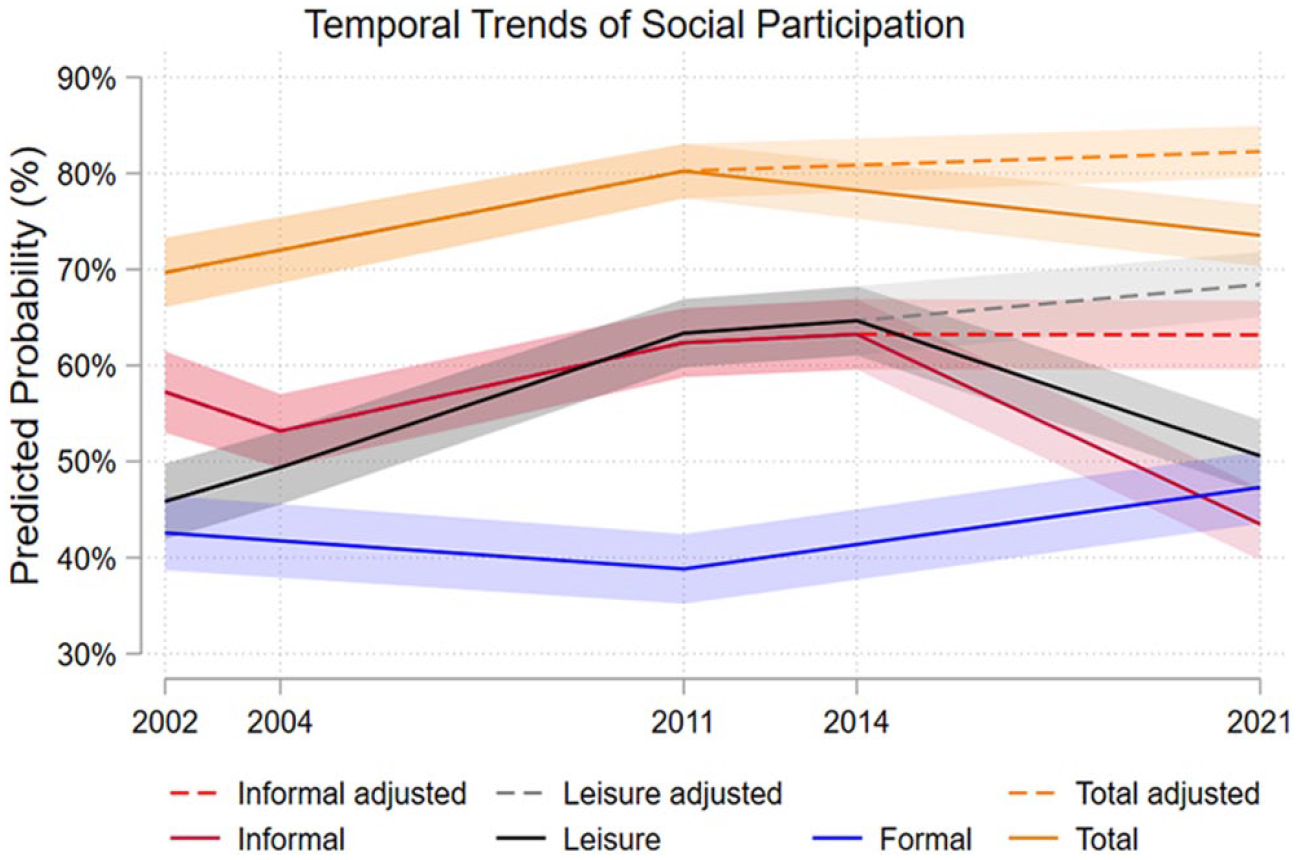 The decomposition analysis revealed that a significant portion of the observed trends in social participation could be attributed to changes in educational attainment and functional ability. Compositional changes in these factors explain part of the increasing trend in leisure participation, in roughly equal amounts. High functional ability allows for freedom of movement which in turn means easier access to various spaces. Educational attainment affects income and is a determinant of cultural taste and norms [27], which in turn influence various forms of social engagement. Education not only increases skills and pro-social behaviours [8] but also impacts individuals’ access to the labour market, potentially shaping their social opportunities through expanded networks and contacts. As more people have higher education levels in more recent years there may be increasing inequalities between those with more and less education. There is some evidence for socioeconomic inequalities in social participation increasing in older ages and over time [28].