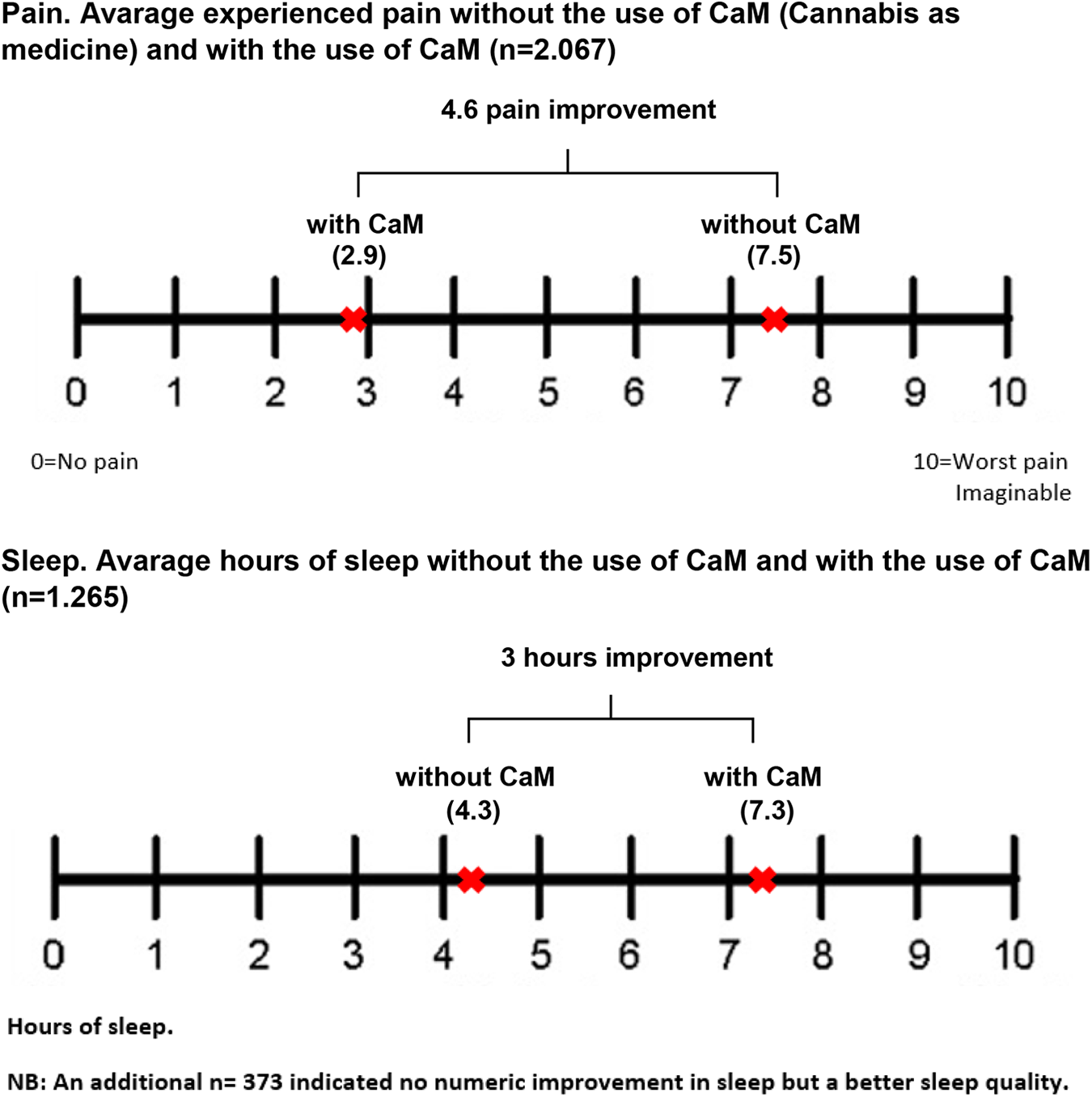 The heterogeneity among the CaM users in the current study is reflected in the great variety in motives for use, as they involved a broad range of somatic and mental health conditions, of which chronic pain, sleep disturbances, stress, osteoarthritis, anxiety, and depression were most prevalent; a finding which resembles other studies (Corroon & Phillips, 2018; Lintzeris et al., 2018; Lucas et al., 2019; Park & Wu, 2017; Reinarman et al., 2011; Sexton et al., 2016; Walsh et al., 2013; Ware et al., 2005). The fact that sleep disturbances and stress were among the most prevalent conditions treated with CaM, may indicate a tendency to manage these conditions without formal medical advice and assistance, or that these conditions are more likely to be underdiagnosed, as they are often co-morbidities of other somatic or mental health conditions (Cranford et al., 2017; Melkevik et al., 2018). The reported effects of CaM on pain and sleep found in this study were substantial, and while it can be argued that pain is a subjective experience (Koyama et al., 2005), the improvement in number of hours slept provides a more tangible and objective result. An improvement in sleep may mediate an improvement in somatic and mental health conditions. A plethora of studies have found that sleep disturbances are associated with an array of disease risk (Laposky et al., 2016) and mental health disorders (Sutton, 2014), such as anxiety and depression (Alvaro et al., 2013). Indeed, there is an intimate and bidirectional relationship between sleep and emotion (Kahn et al., 2013), and a positive change in sleep patterns improves positive affect and overall wellbeing (Ong et al., 2017). However, research on cannabinoids and sleep is in its infancy, and more research is needed regarding the long-term effects on sleep patterns (Babson et al., 2017).