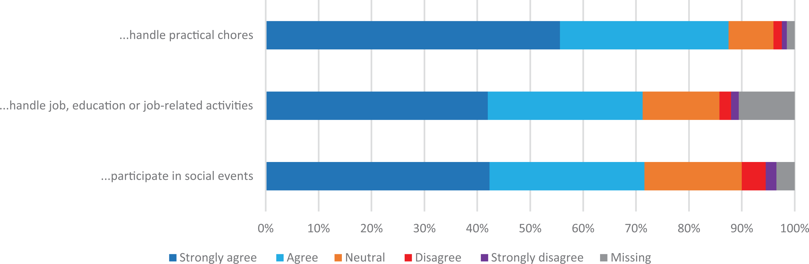 A total of 87.5% agreed/strongly agreed that their use of CaM made it easier to handle practical chores in their daily life, 71.3%, agreed/strongly agreed that CaM made it easier to handle job, education or job-related activities, and 71.6% agreed/strongly agreed that CaM made it easier for them to participate in social events (see Figure 3).