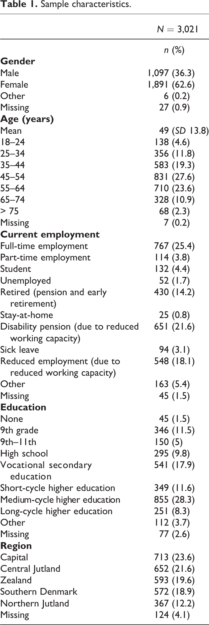 A total of 4,570 respondents opened the survey, and 3,140 answered all questions. Of these, 119 respondents were excluded: 59 were under the age of 18 years, seven respondents had inconsistencies in answers, and 53 were identified as duplicates, leaving a total number of respondents of 3,021 (see Table 1).