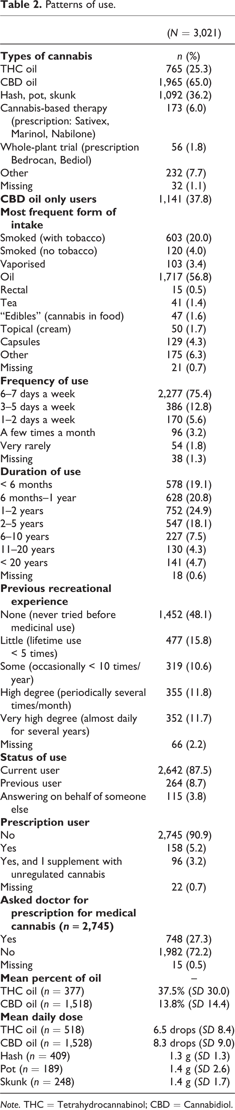 Respondents were presented with a list of cannabis products, and could choose more than one. Respondents were presented with a list of forms of most frequent intake, and could choose only one. All users were asked to indicate their daily dose of cannabis, either as drops of oil or grams of plant matter. Users of CBD oil and THC oil were asked to indicate the strength of the oil as a percentage. Further, we asked users to indicate the level of “recreational (non-medicinal)” use of cannabis before their use of CaM.