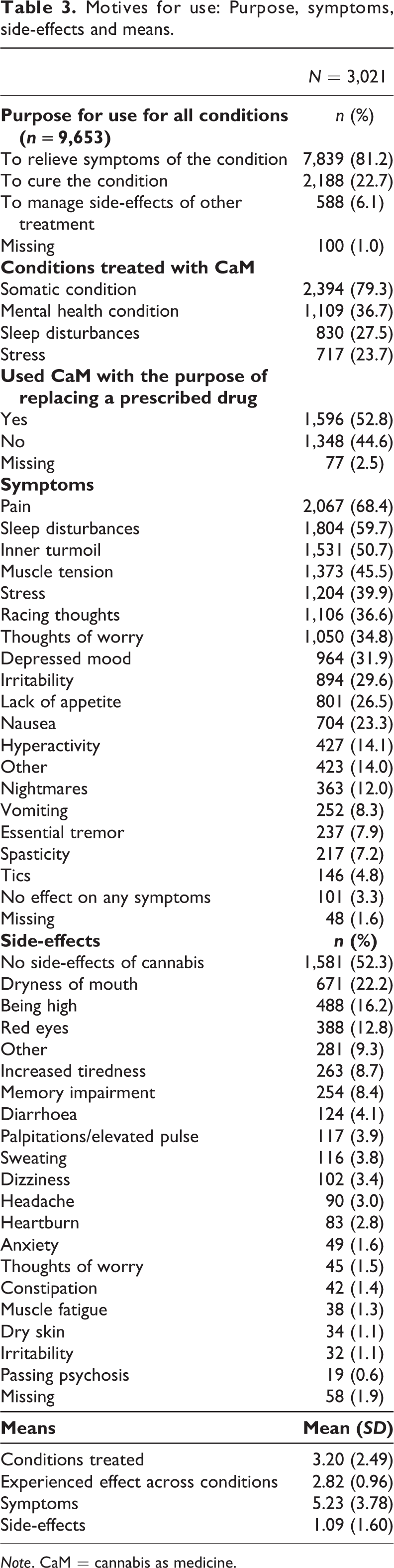 Motives for use: Purpose, symptoms, side-effects and means.
