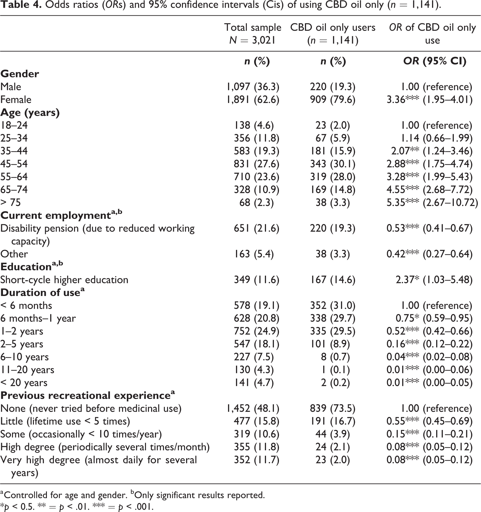 The study resembles previous studies in terms of recruitment strategies and findings on motives for use, but differs from some studies in terms of demographics and patterns of use. Two studies (Lintzeris et al., 2018; Sexton et al., 2016) reported a majority of male users, a mean age in the late 30s, and more than 80% reporting inhalation as the most common form of intake. The difference in samples and study findings is likely to reflect the rapid change in the use of CaM, due to the increasing popularity of medicinal use of CBD oil (see also Hazekamp, 2018; Manthey, 2019). Of note, a recent survey on the use of CBD products in the US found that the majority of medicinal CBD users were women, and that nearly half were over 55 years of age (Corroon & Phillips, 2018). These findings match the findings from our study, where the odds of using CBD oil only were higher among women and increased with age.