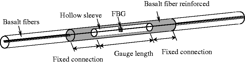 FRP, with its advantages of high strength, light weight, and corrosion resistance, is mainly used for the reinforcement of civil engineering structures. The effects of existing cracks in concrete with different spacing and widths and the FRP’s location relative to the centerline of the specimen were discussed. Research regarding the degradation of the tensile properties of pre-stressed basalt fiber-reinforced polymer (BFRP) and hybrid FRP tendons in a marine environment was performed by Xin Wang et al. 23 The results show that the BFRP tendons have superior resistance to salt corrosion. Due to its lightweight, corrosion resistance, and a linear elastic modulus similar to concrete, BFRP is applied in long gauge sensors to protect FBG sensors against the harsh environment outside the bridge and to increase the lifetime of the sensors.