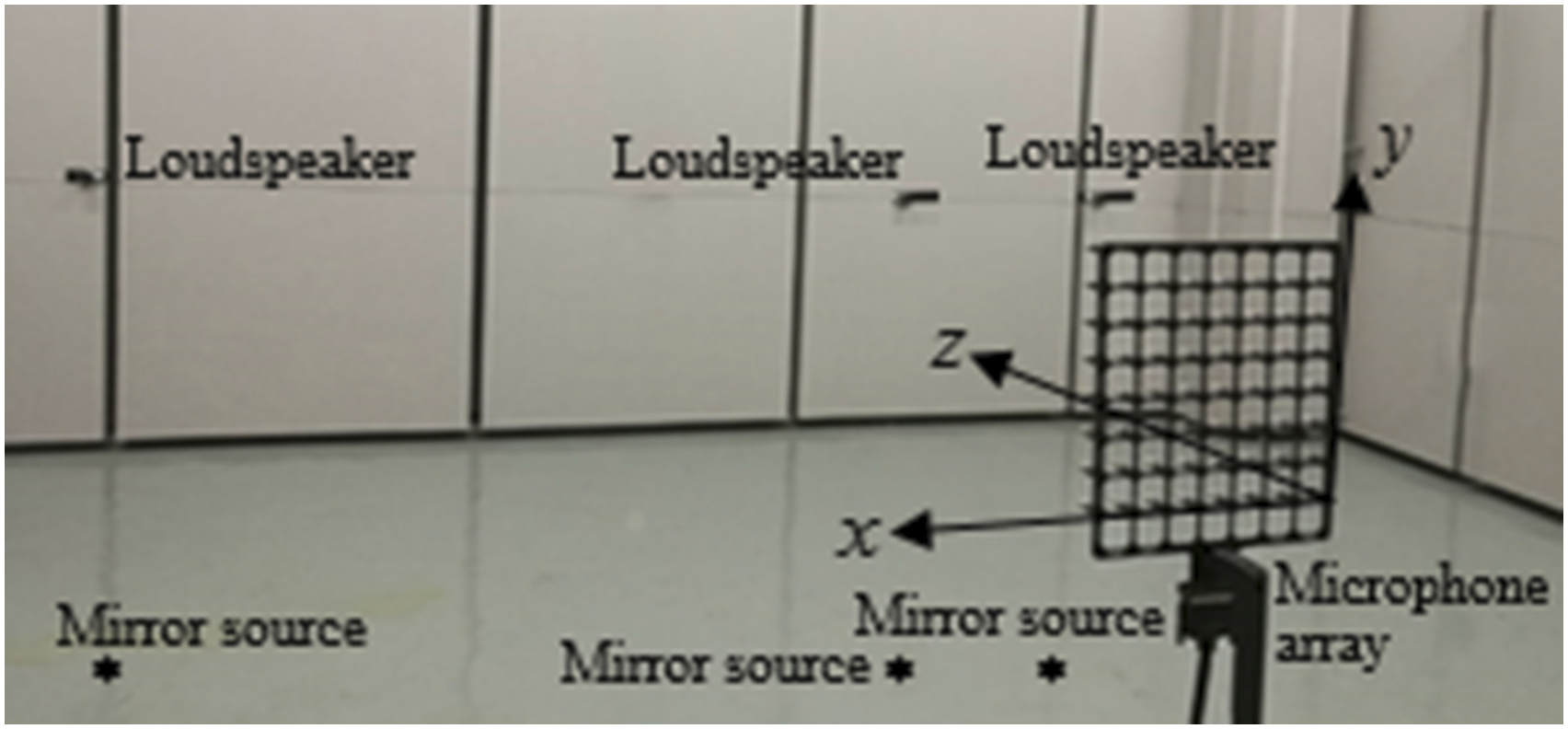 As shown in Figure 9, in a semi-anechoic chamber, we use a URMA with 64 Brüel&Kjær Type 4958 microphones to conduct an experimental measurement on three small speakers to verify correctness of the simulation conclusion. The array parameters are as follows: Experimental layout.
