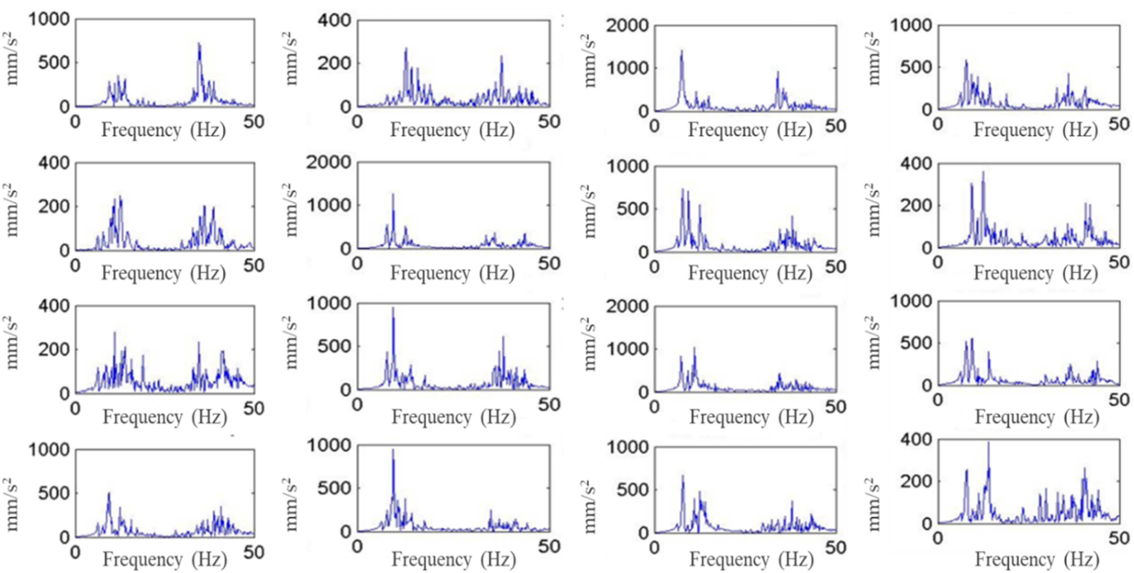 From each dataset of vibration signals on the bridge, we can build a power spectrum density based on Fourier analysis theory, as shown in Figure 19. Building power spectrum density from acceleration measurements.