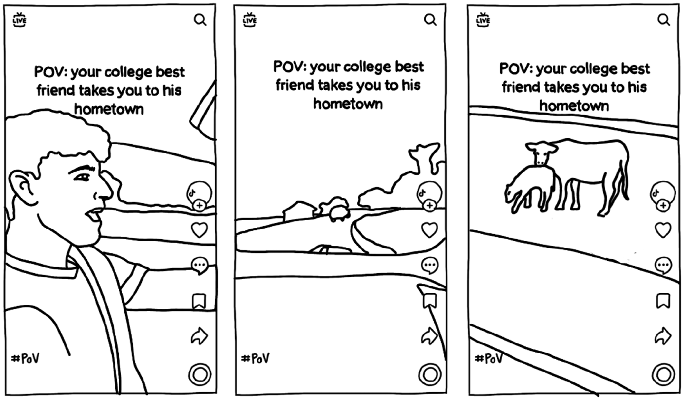 A second, less-frequent narrative structure in PoV memes still features “you” as the textual protagonist but presents visuals shot from a first-person perspective. For example, the textual component of Meme_35 states “PoV: your best friend from college takes you to their hometown.” The images feature a sequence of first-person shots taken from the passenger seat of a car moving through a small town in the rural United States. As the soundtrack plays an old-timey banjo, the viewer is presented with the subjective perspective of a city dweller visiting “middle America” for the first time (Figure 3).
