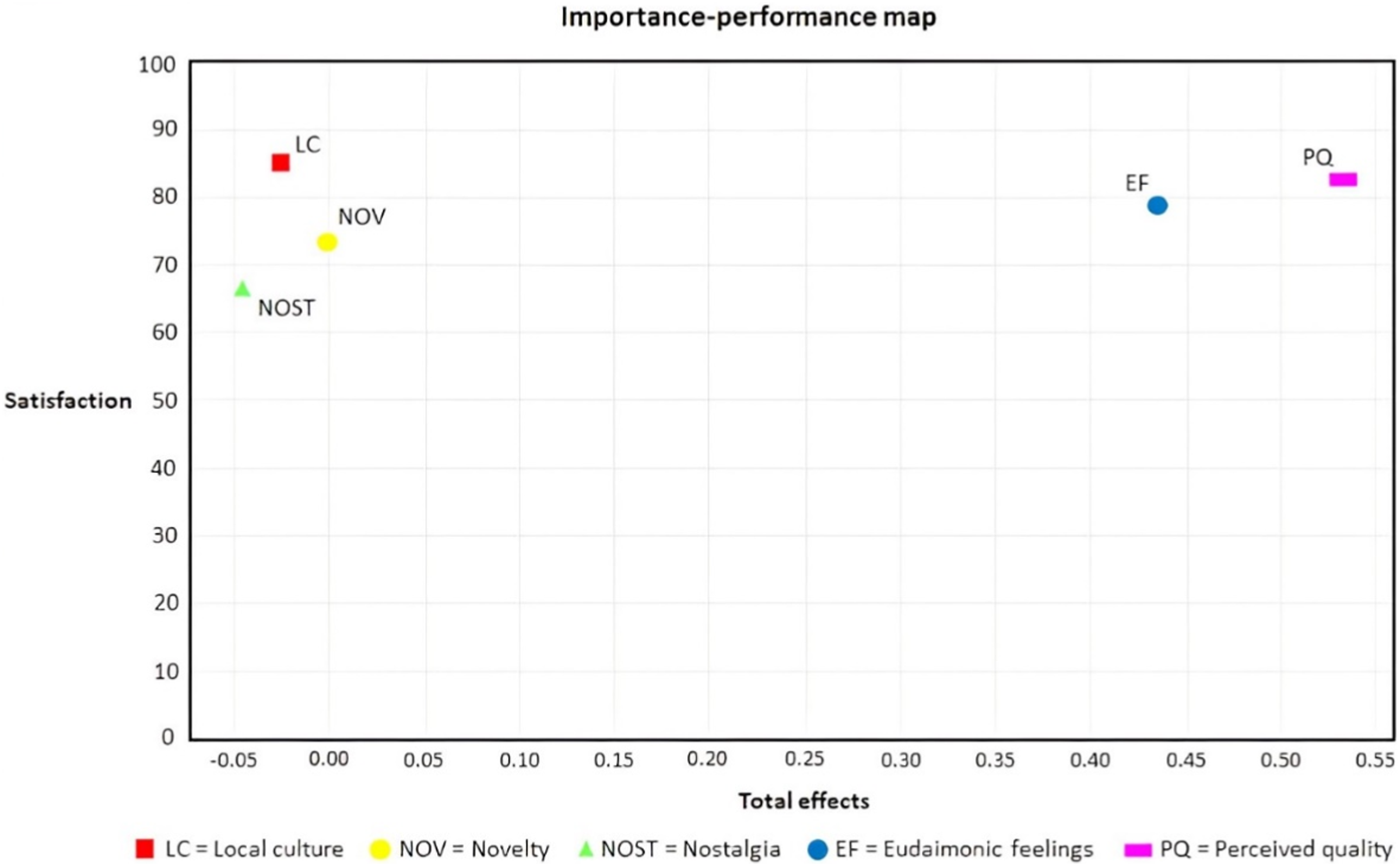 EF = Eudaimonic feelings; LC = Local culture; NOV = Novelty; NOST = Nostalgia; PQ = Perceived quality; SAT = Satisfaction; BI = Behavioural intentions.
