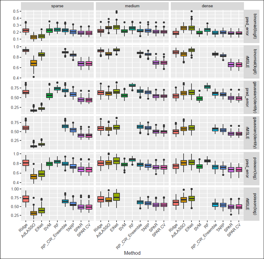 Generally, SPAR and SPAR-CV were among the best-performing methods in all settings, except the sparse ones, where it was outperformed by AdLASSO and elastic net in terms of prediction and link estimation. In particular, SPAR seems to inherit strong prediction performance in dense cases from the L2-estimator in the screening (also used in the RP), while yielding stronger predictions compared to dense methods in medium and sparse settings. Especially, the performance in link estimation for the logistic regression is remarkable.