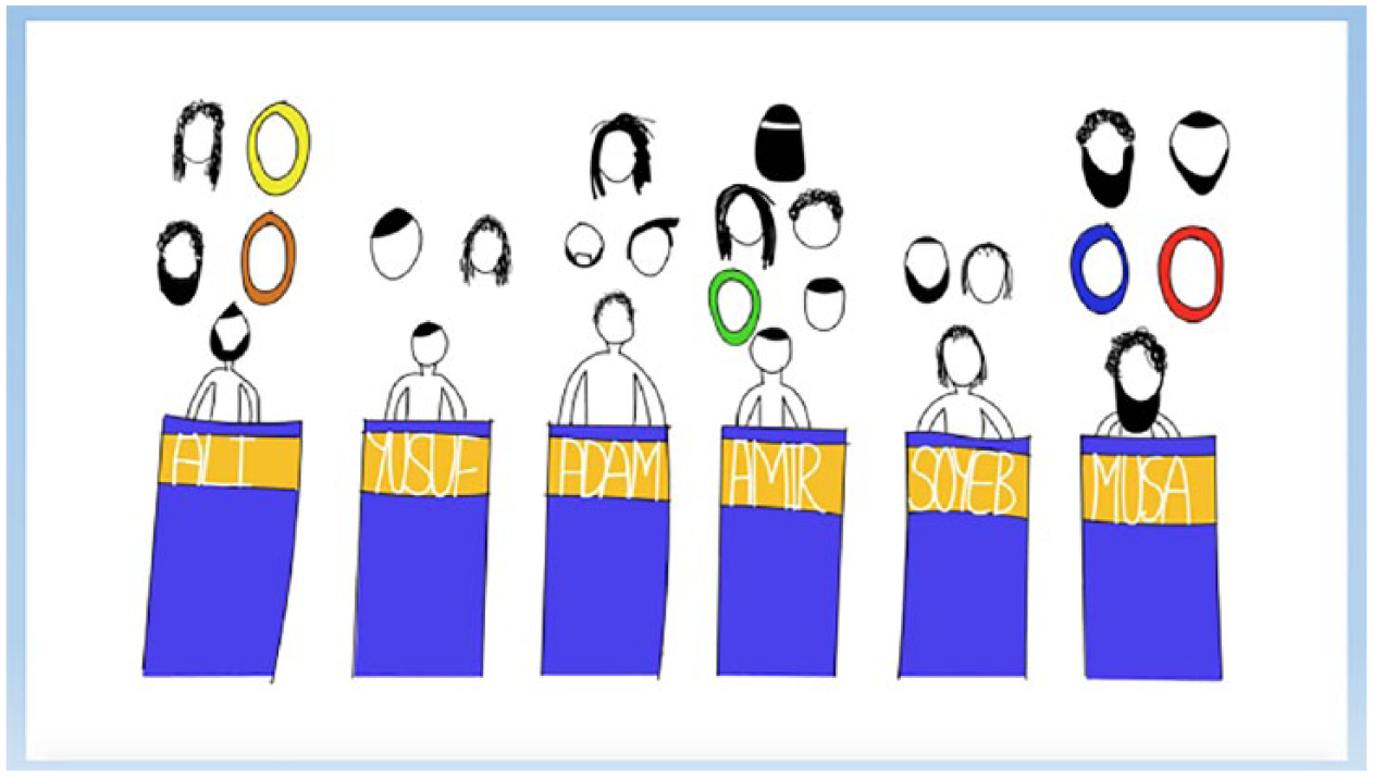 The interaction between participants was generally expressed less in the dominance of some than in collective discussion, persuasion and consensus-building. This was aided by the facilitator and researchers, but primarily arrived at by participants themselves: ‘We used a democratic process with everyone voting for their favourite idea for each screen. When there was disagreement it was good-natured and compromise was reached or justifications given’. 62 When some mildly controversial issues arose, the participants listened to each other and came to joint decisions. In the first workshop, Zarah stated that younger generations of British Muslims were more educated than their elders. 63 Later, she worried that this might come across as disrespectful to her parents’ generation. The others understood her concerns but felt her point could be made in a respectful way and should be included. The group agreed that this content was appropriate because, as Stacy observed, ‘it talked about how the labour of the parents working hard after moving over to the United Kingdom created the opportunity for the younger generation to devote more time to their education’. 64 Zarah could have vetoed this decision, but she accepted the consensus. The group also made collective decisions about what they wanted to draw. 65