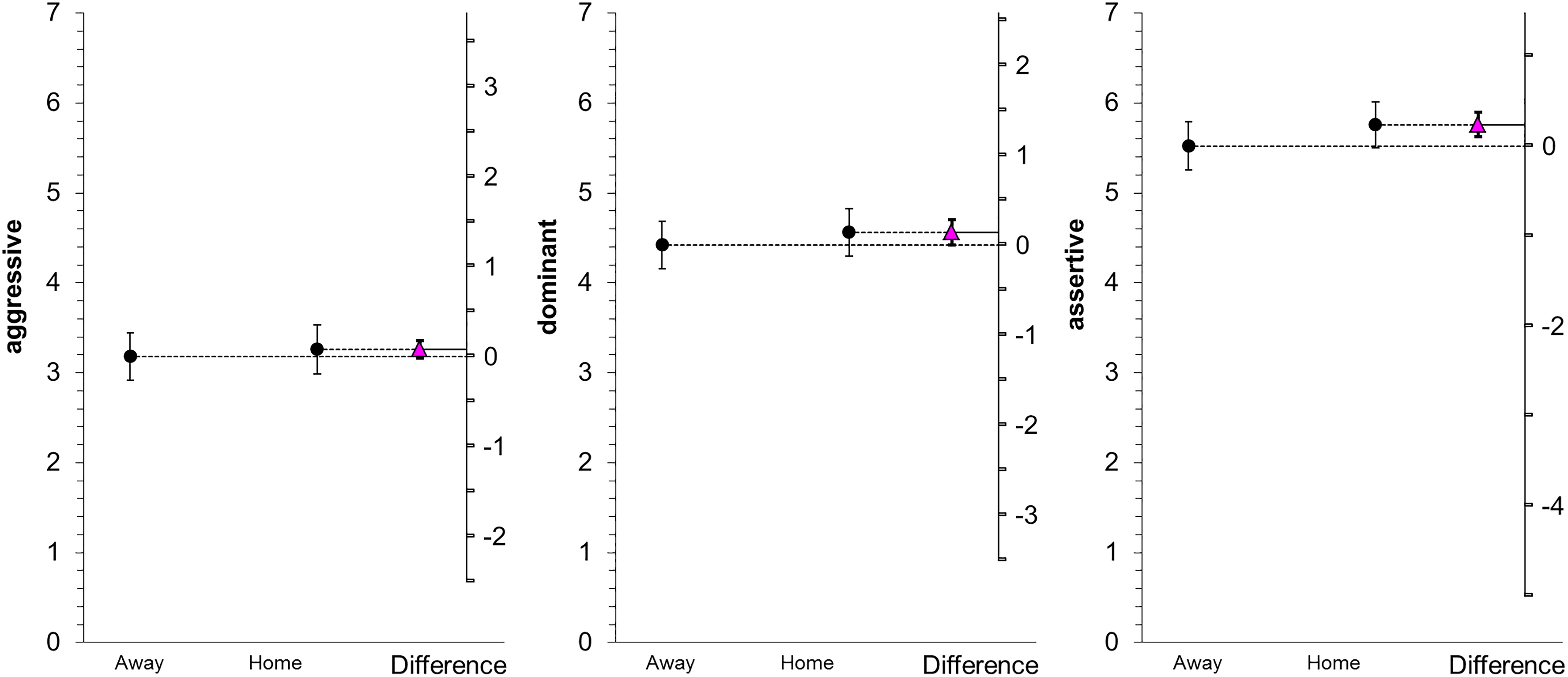 Mean aggression (left), dominance (middle), and assertiveness (right). Ratings of the group viewing the original jerseys as a function of game location in Experiment 2. Error bars represent 95% confidence intervals.
