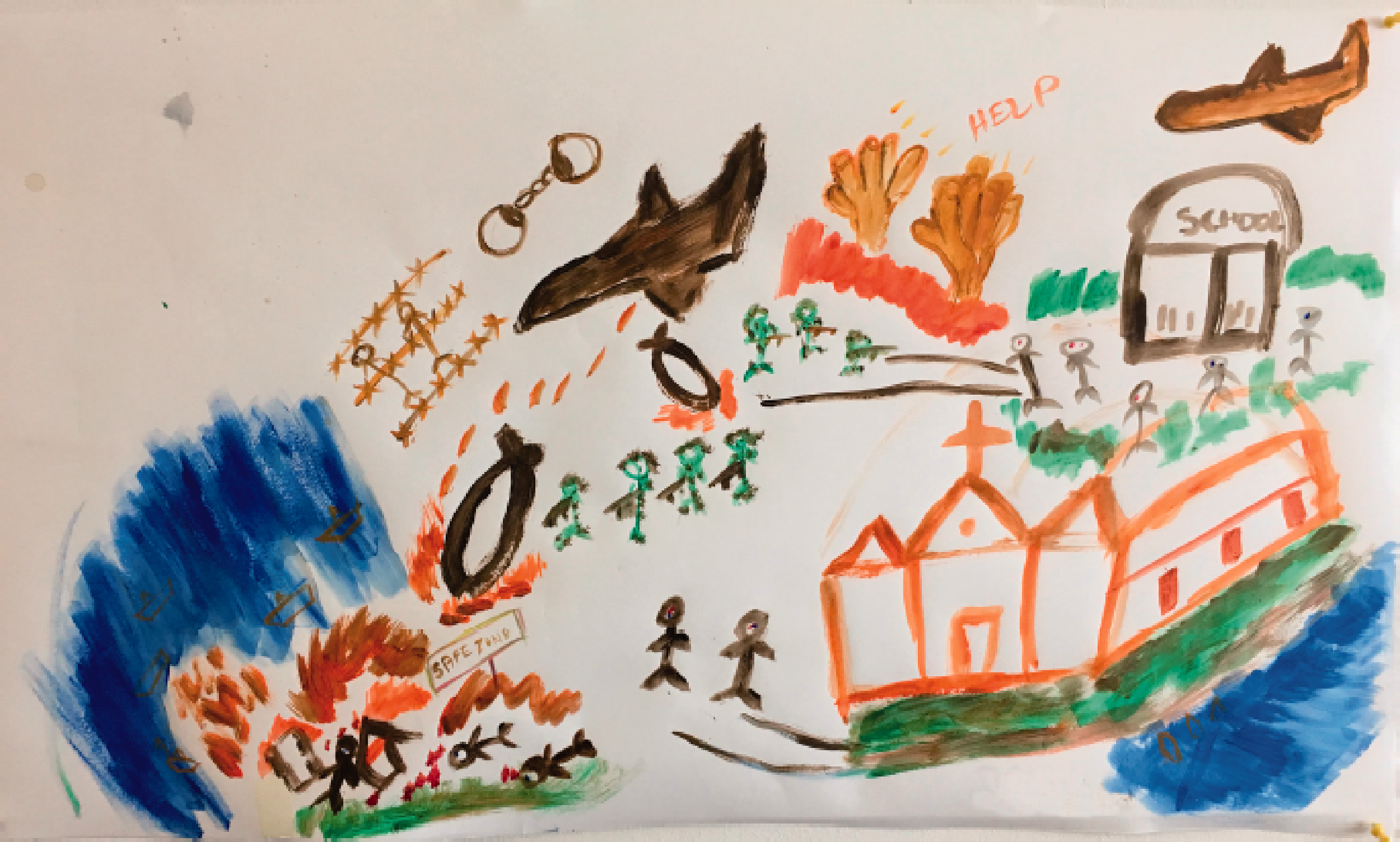 Workshop 1. The image shows the bombing of a town, a school, and a church. There are dead people in the ‘safe zone’, barbed wire and handcuffs. Ashan explained: