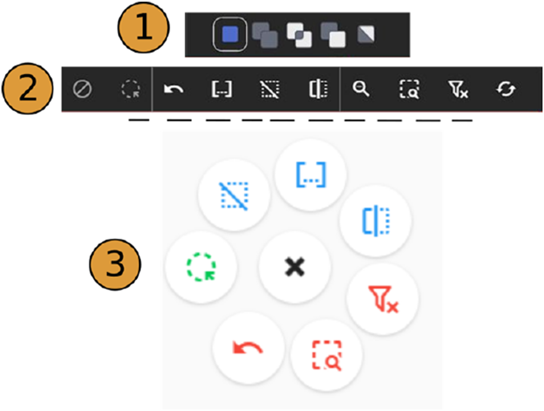 ) through actions like replacement, addition, intersection, subtraction, and toggling or negating. The users can choose an operation, invert and clear selection by key modifiers or on fixed or floating menus (Figure 3). (1) set-based operations applied on selections. (2) toggling inspection (left), selection modes, creating sets, clearing and inverting selection (middle), information-seeking functions, e.g. zoom, filter, and resetting dataset (right). (3) On-demand context menu with frequently needed functions, where colour-coded icons distinguish their category (inspection, selection or information-seeking).