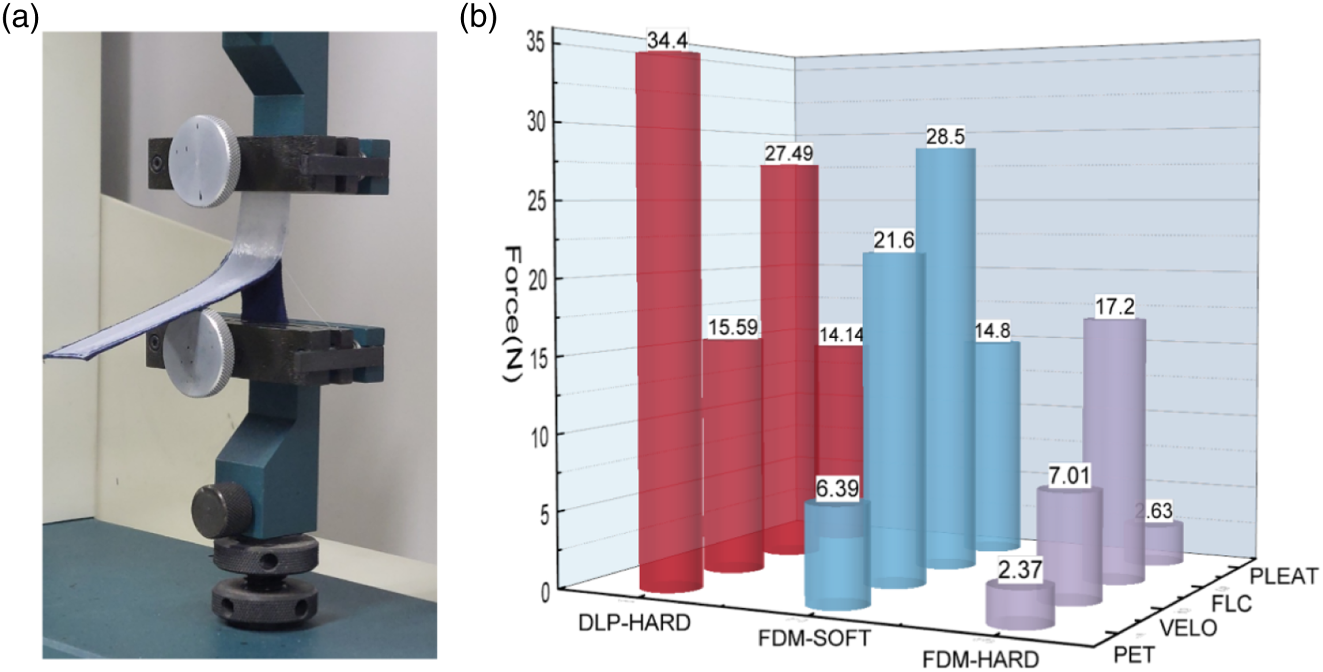 The adhesion forces of the composite fabrics produced with the FDM and DLP methods are shown in Figure 3. Figure 3(a) is a photograph of the peeling test machine. Figure 3(b) presents the adhesion force measures, and the results are also presented in Table S3. Adhesion forces of the composite fabrics. (a) Photo of the peeling test, (b) adhesion force results.