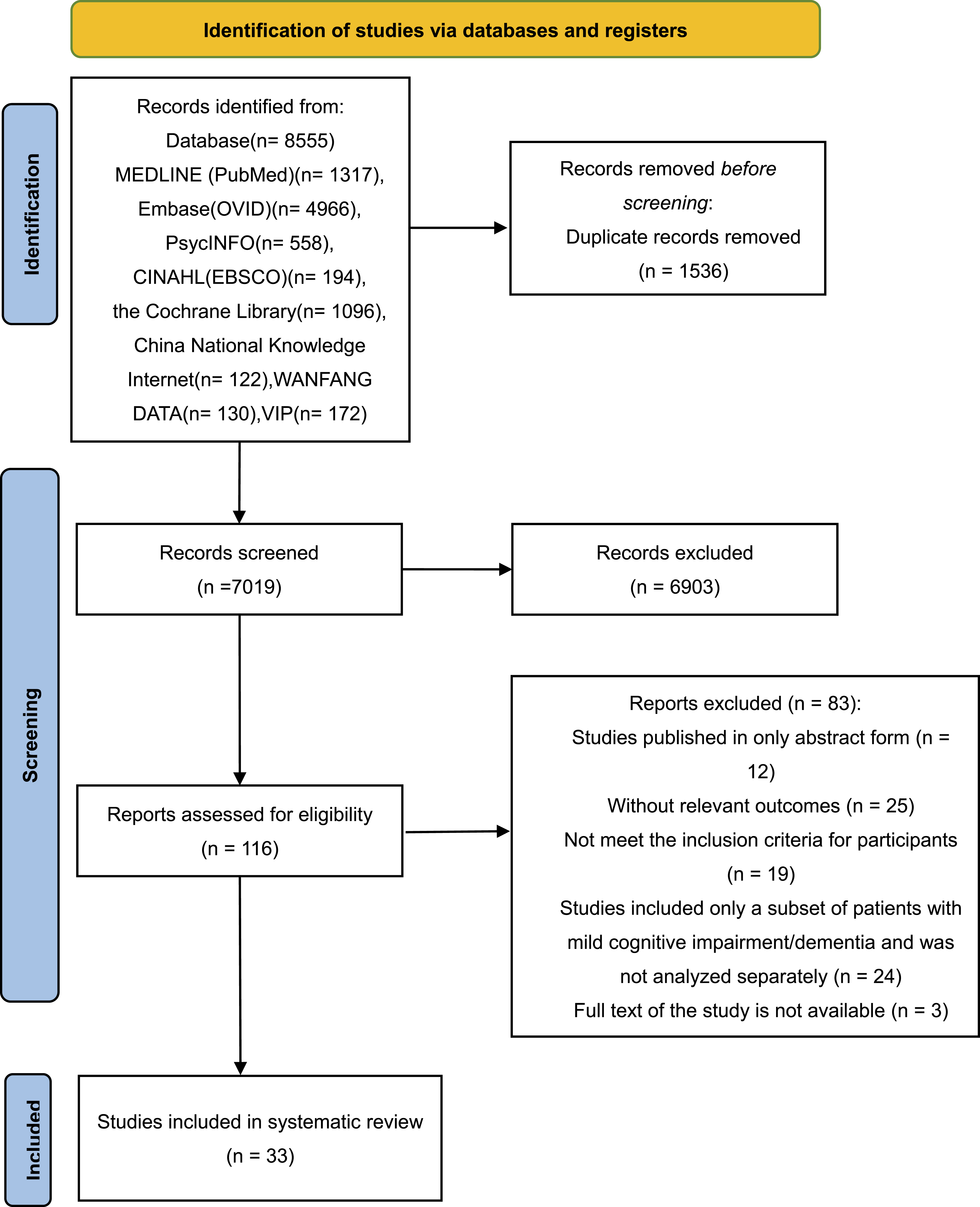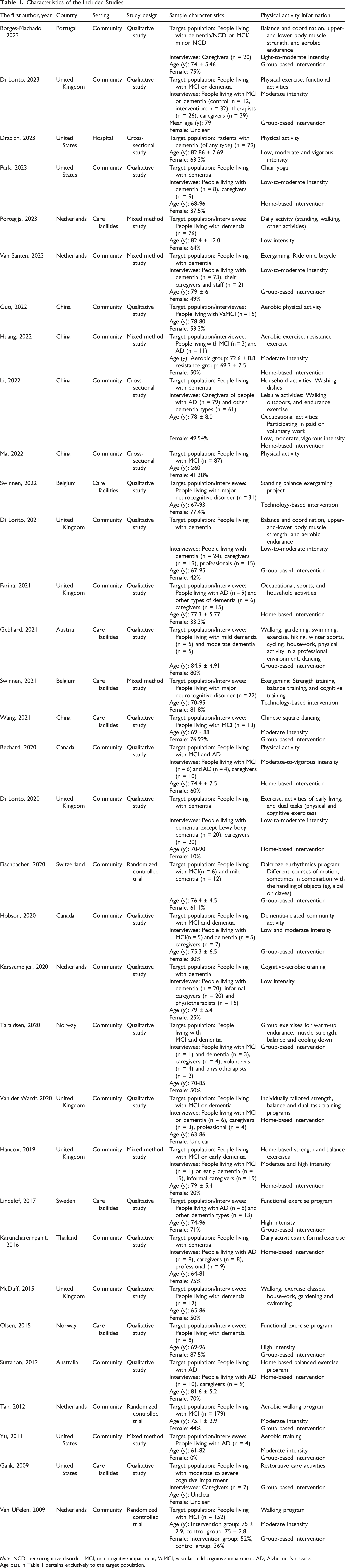 Studies that met any of the following criteria were excluded: (1) conference abstracts, letters, research protocols, and dissertations; (2) physical activity was only part of various forms of activities; (3) older adults with MCI/dementia were only a subset of participants and were not analyzed separately; (4) full text was not available.