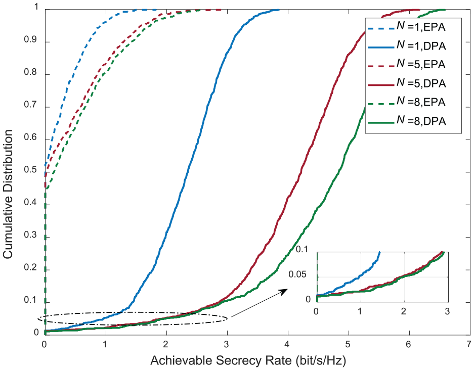 Figure 3 shows the cumulative distribution function (CDF) of the achievable secrecy rate by the user. We focus on the performance gain brought by multi-antenna APs deployment. When , it is the special case that all APs are single antenna in prior studies. Considering EPA for simplicity, no matter how many APs are deployed by single antenna or multiple antennas, the achievable secrecy rate is almost zero. With DPA, achievable secrecy rates are monotonically increasing with the antenna number of APs. This can be explained by the fact that when rises, the legitimate channels between APs and users are more favorable. -likely performance7 is observable to analyze the level, which has a % chance to be achieved. Zooming in on the lower segment of the plot in Figure 3, the security rate of the user when each AP is set with 5 or 8 antennas deployment is about 2 bit/s/Hz, which is twice as high as that of only single antenna. It also proves the conclusion by Irmer et al.9 that multi-antenna APs can inherit benefits from channel hardening.