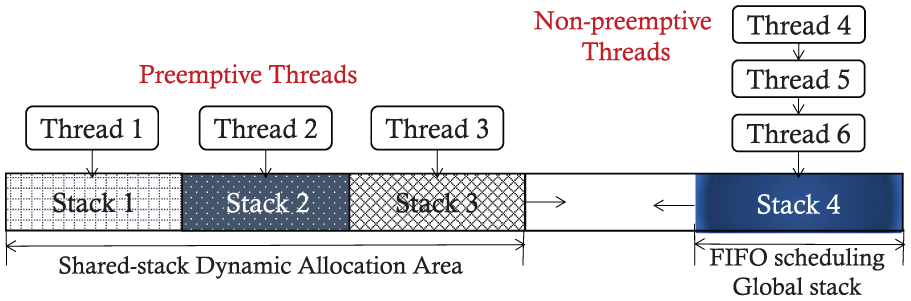In the conventional multithreaded system, each thread runs in the independent pre-reserved stack, and the stack size is reserved statically by estimation. To avoid the overflow problem, the stack size is commonly reserved to the large value which can meet the worst-case scenario, for example, the stack size in uCOS is assigned to 128 bytes for the 8-bit AVR microcontroller. 10 Yet, not all the reserved stack memory will be used during the run time in this case. As a result, the memory waste problem will exist (Figure 2(a)).