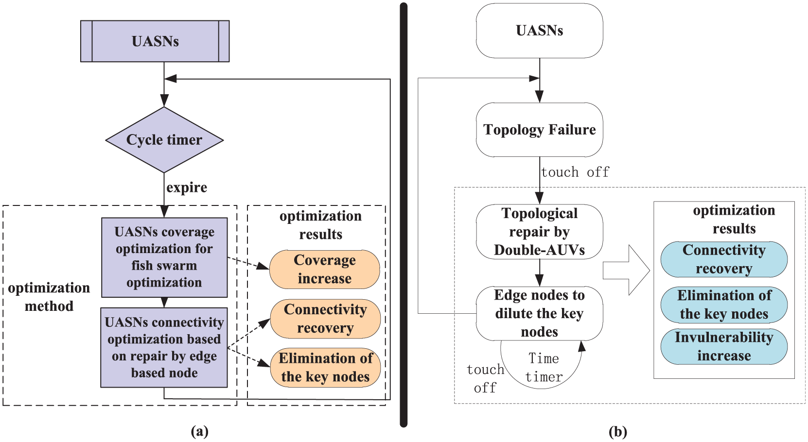 In this article, we propose a topology optimization scheme based on reorganization, namely, TO-A algorithm that maintains connectivity and coverage, and a topology optimization mechanism based on Double-AUVs, namely, TO-DA algorithm that prolongs the life cycle and connectivity of UASNs. To be more specific, the TO-A algorithm’s purpose is to address the problem about topology affected by ocean currents and other environmental factors that leads to the dynamic evolution of network and generates gradual reduction in the performance of UASNs; the TO-A algorithm not only adjusts the location of sensor nodes by simulating the fish swarm behavior so as to optimize the coverage, but also uses the edge nodes to repair the disconnected position in the UASNs so as to eliminate the key nodes and optimize the connectivity. Although the TO-A algorithm presented above, compared with other algorithms can effectively improve the connectivity of the network and optimize the coverage with lower energy consumption, the TO-DA algorithm is a further research for executing the underwater long-term missions. We redefine the Double-AUVs and propose the TO-DA algorithm. The TO-DA algorithm not only repairs the failed node by Double-AUVs, but also takes into account the frequent topology repair, which leads to a reduction in the lifetime of the network. So, after the repair is completed, the algorithm begins to carry out the operation that eliminates the key nodes, which will improve regeneration and survivability of UASNs in uncertain ocean environment.