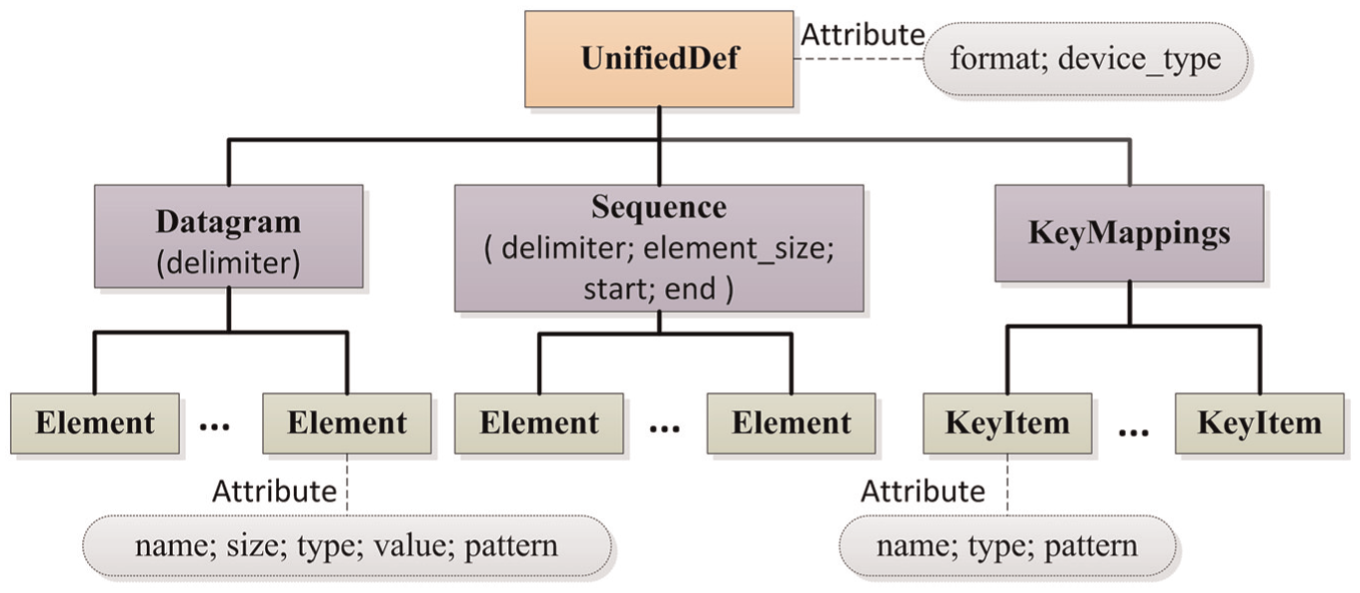 XML is rapidly becoming the standard for data exchange between machines. XML schema express shared vocabularies and allow machines to carry out user-defined rules by providing a means for defining the structure, content, and semantics of XML documents. As such, XML is useful for integrating structured, semi-structured, and unstructured data in an IoT environment. Therefore, the DSDM representation is based on XML syntax. In general, semantics refer to the explanation of data symbols, such as the meaning of classes, elements, and constraints. In this article, DSDM describes the meaning of the features in a device datagram. A DSDM is an abstract expression and definition of a device datagram and includes features such as a set of predefined keywords, the built-in schema type, expression, and operator function, as summarized in the following definition.