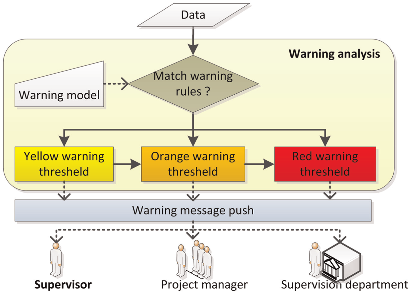 A warning rule is based on changes in the characteristics of a monitored item and functions according to a user-defined warning model. To meet different levels of urgency, each type of warning model is divided into three levels, which are presented in Figure 8. The three warning levels are blue, yellow, and red. Whenever a given threshold established for a monitored item is exceeded, a warning signal must be transmitted to the interested parties for enacting adequate countermeasures. The yellow warning level transmits a warning message to the security supervisor of the construction project. The orange warning level transmits the security issue to the project manager. When the system issues a red warning, the highest of the three-level warning system, the security issue may represent a significant security risk that may potentially lead to an exceedingly serious safety condition. Therefore, the red warning message transmits notification of the hazard to the supervision department. In addition, while the warning system provides real-time notification, it also records the alarm information and corresponding data stream for later query.