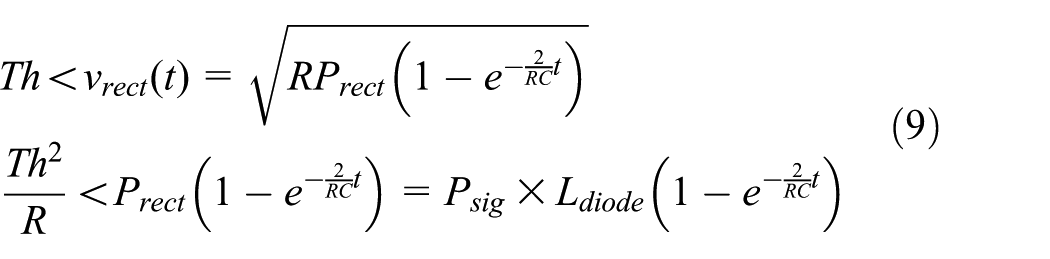 The response time of the RF wakeup sensor depends on the design parameters of a detector since the parameters affect the time for charging a capacitor within the detector. To analyze the response time, we first calculate the minimum signal strength that can be sensed by the detector,