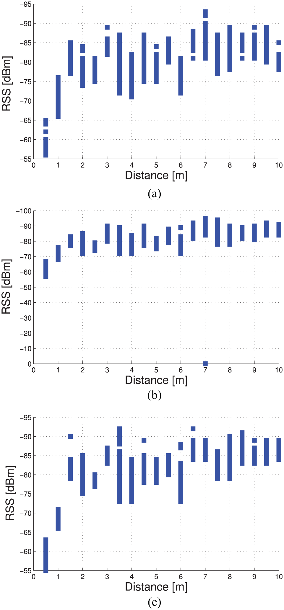 Average RSS from a single iBeacon node to a smartphone at several times of a day: (a) 9 a.m., (b) 2 p.m., and (c) 6 p.m.
