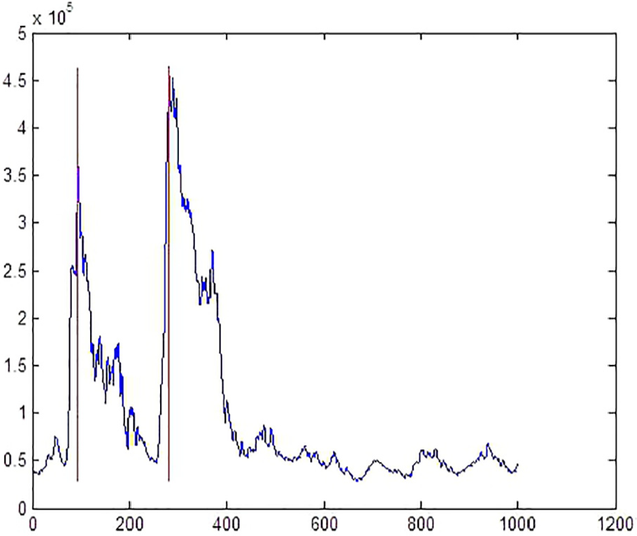 Red lines are located at the two major peaks by the use of the MPR method with the width parameter set to 10 times of the instruction width.