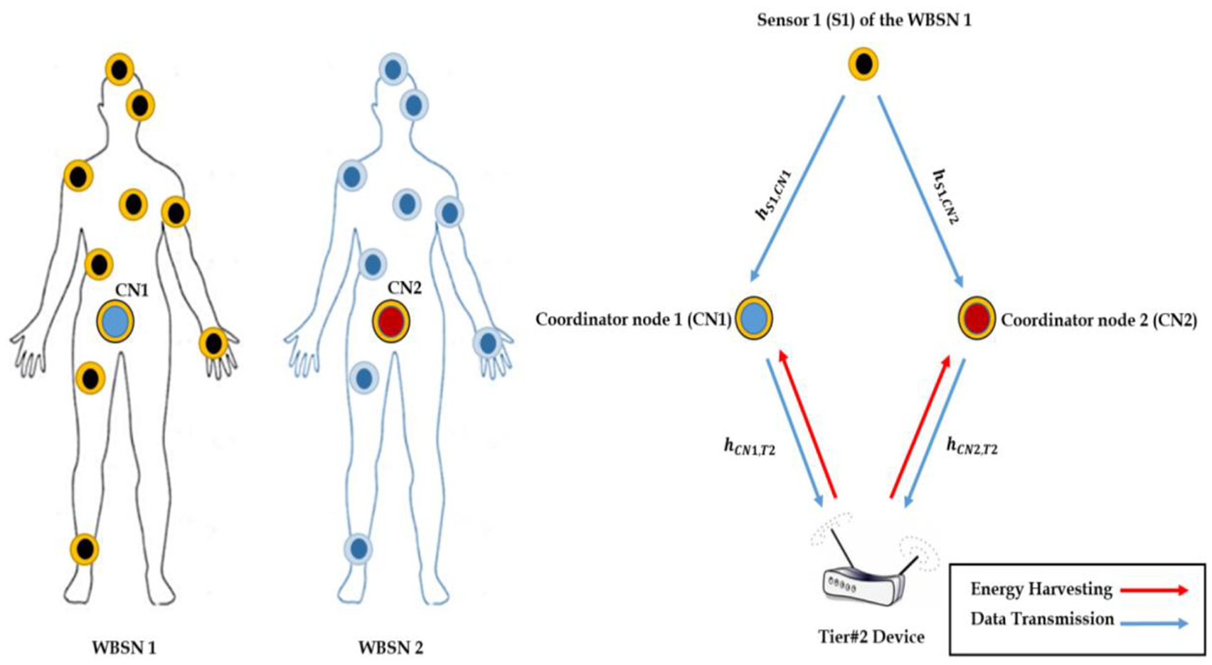 In this work, three protocols are designed and investigated along with an EH technique. We name and abbreviate the protocols as energy harvesting–based dual-hop cooperation (EH-DH), energy harvesting–based inter-WBSN cooperation (EH-IWC) and energy harvesting–based incremental inter-WBSN cooperation (EH-IIWC).