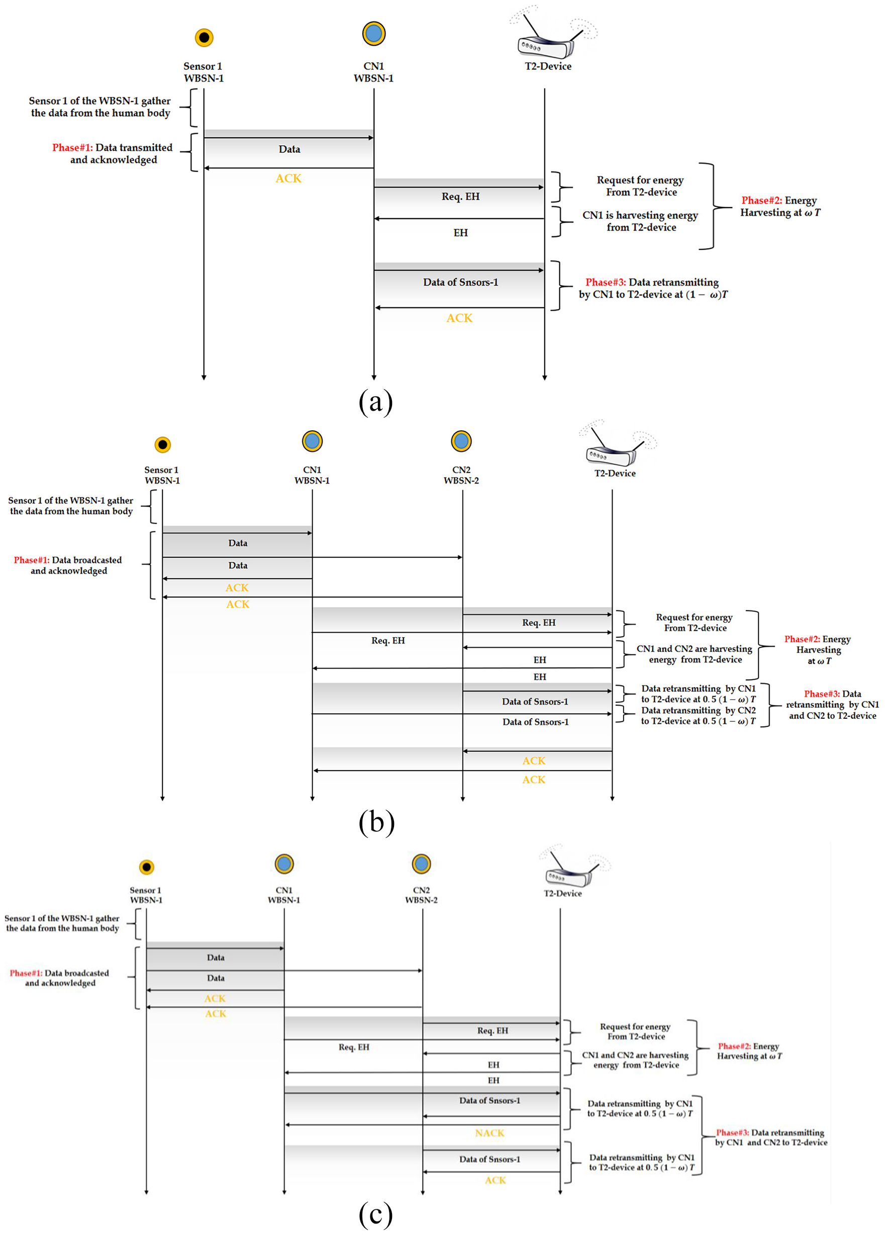 Overall sequences of the proposed protocols: (a) overall sequence of energy harvesting–based dual-hop cooperation (EH-DH), (b) overall sequence of energy harvesting–based inter-WBSN cooperation (EH-IWC) and (c) overall sequence of energy harvesting–based incremental inter-WBSN cooperation (EH-IIWC).