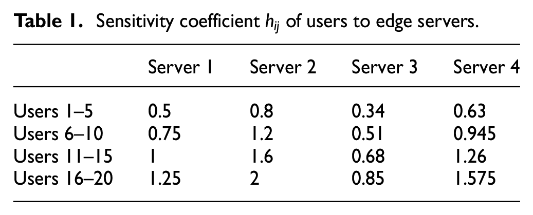 Assume that the number of tasks that each edge server can compute is 16, and that the user’s transmit power is 200 Mw.42,43 If there is no special explanation, the user’s energy preference ratio and price preference ratio are set as 0.5 and 0.5, respectively. In addition, the initial prices of edge servers 1, 2, 3, and 4 are 50, 60, 70, and 80, respectively.