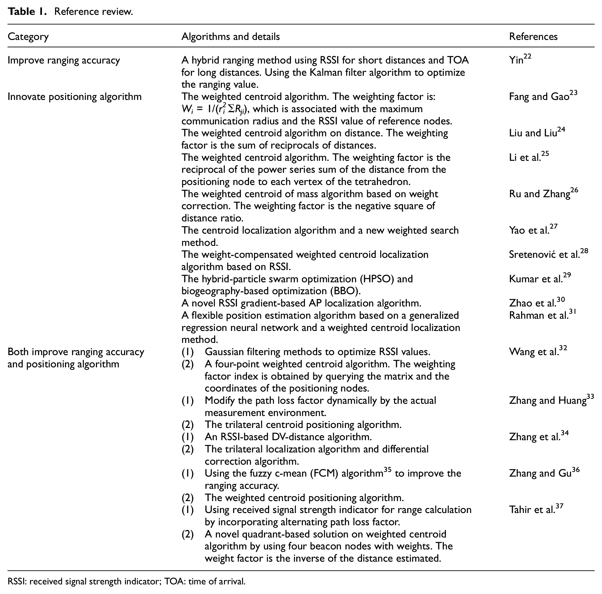 However, as most nodes in wireless positioning networks both transmit and receive signals, and as the RSSI value can be measured without the need for additional hardware costs, 21 RSSI-based positioning methods can significantly reduce system costs and are more suitable for tunnel personnel positioning. Because of these benefits, a lot of significant researches have been done on RSSI-based positioning algorithms to improve the accuracy of the algorithms. These studies focus on improving ranging accuracy and innovating positioning algorithms; the details of references are shown in Table 1.