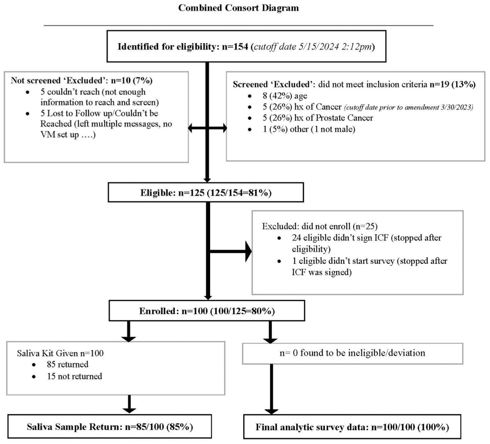 The primary focus of this study was to assess individual prostate cancer genetic risks and susceptibility beliefs among unaffected men and evaluate the willingness to provide a biospecimen (saliva sample) for prostate cancer genetic testing and determine genetic risk category. Compared with women, men participate less in genetic research, mostly due to lower awareness of genetic risk and genetic risk testing (Peshkin et al., 2021). In particular, Black men are significantly underrepresented in genetic research due to historical mistrust of medical research, lack of awareness about genetics and genetic testing, concerns regarding data usage, and limited access to research opportunities (Connor et al., 2022). Thus, this article centers on recruitment, enrollment, and biospecimen collection outcomes, and beliefs in genetic testing from a pilot study with unaffected men from diverse race and ethnic backgrounds. The findings from this pilot study are essential to understanding the feasibility and effectiveness of recruitment strategies, participation rates and provide insights into the challenges, opportunities and lessons learned that inform design of future larger studies. This study was approved by Advarra Institutional Review Board (IRB no.: Pro00063775).
