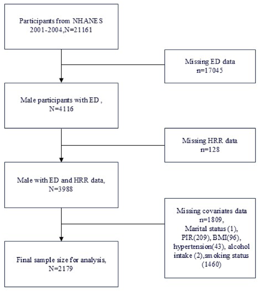 Our study is not devoid of limitations. Primarily, our analysis is grounded in data sourced from the NHANES cycles spanning from 2001 to 2004. Given the substantial demographic shifts that have transpired thereafter, the applicability of our findings to the contemporary population is constrained. Future endeavors could involve examining the influence of HRR on ED within subsequent NHANES cycles. Furthermore, as a cross-sectional study, our research can merely illustrate the correlation between HRR and ED, falling short of establishing causality. In the coming years, we intend to pursue clinical trials or further follow-up studies and conduct larger-scale longitudinal research to delineate the causal link between HRR and ED and validate its predictive prowess across diverse populations. A major barrier to translating these results into practice is the current lack of a validated HRR threshold for ED risk stratification. Establishing this cut-off is a pivotal next step toward clinical application. If validated, HRR could be incorporated into existing ED risk assessment frameworks as an early-warning indicator of potential inflammation or vascular burden. This might prompt earlier clinical implementation of lifestyle interventions (e.g., weight loss, dietary improvement, exercise) to ameliorate inflammatory status, enhance hemoglobin levels, and potentially improve HRR itself. Whether such HRR-targeted interventions can translate into a reduced incidence of ED remains a key question to be addressed through randomized controlled trials. A further limitation is the lack of detailed data on psychological factors, medication use, and other relevant inflammatory markers in the NHANES database. The inclusion of such biomarkers would enable a more comprehensive understanding of the underlying mechanisms. Although subgroup analyses indicated a consistent association between HRR and ED across most subgroups, certain discrepancies were observed. Caution is warranted in interpreting these subgroup findings due to potential uncontrolled confounding within each subgroup and insufficient statistical power in smaller subgroups. Moreover, the generalizability of our results requires validation across populations of different ethnicities and geographical regions through multicenter studies. Conducting a systematic review and meta-analysis of existing studies examining the relationship between HRR and urological/sexual health outcomes would be valuable for synthesizing the evidence and quantifying the overall strength of association.