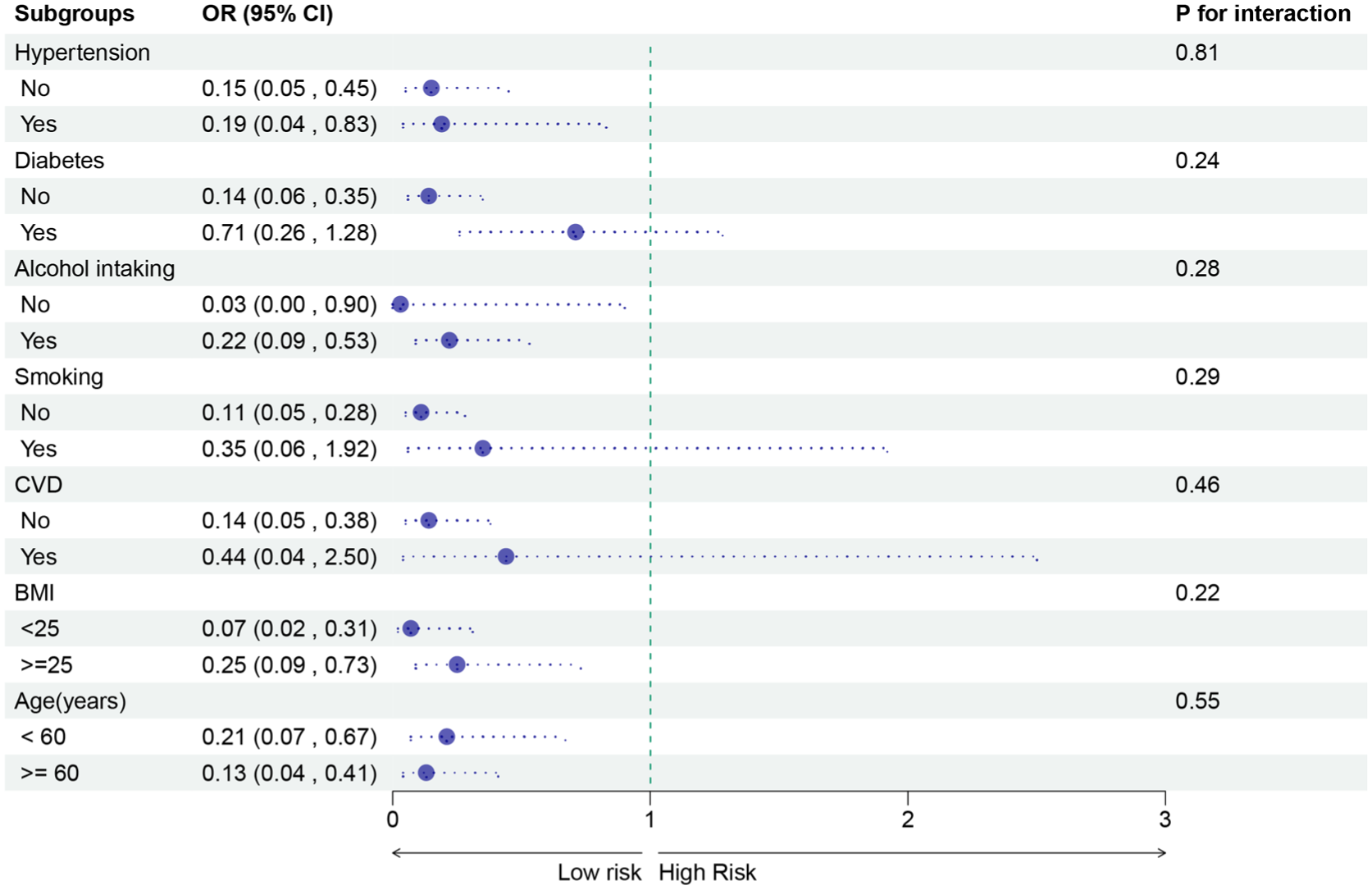Subgroup analyses and interaction tests were used to look into any potential association between HRR and ED (Figure 3). It showed most subgroups had a significant decrease in the risk of ED. It is worth noting that the connection between HRR and ED was more pronounced in the subgroup of participants over the age of 60, no smoking, without diabetes and CVD, drank alcohol, were BMI <25 kg/m2, and had hypertension (all