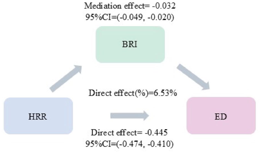 To determine whether BRI mediates the link between HRR and ED, this study constructed a mediation analysis model. The independent variable in this mediation model was HRR, the dependent variable was ED, and the mediator was BRI. Figure 4 illustrates how BRI levels significantly mediated the relationship between HRR and ED, accounting for 6.53% of the total association, with an indirect effect (IE) of −0.031 (95% CI = [−0.049, −0.020]).