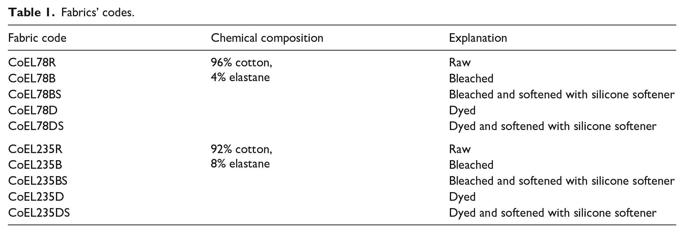 The cotton ring-spun yarn of 20 tex and elastane in a form of multifilament (78 dtex) or monofilament (235 dtex) were used for the production of 1 × 1 rib knitting fabrics containing 96% cotton and 4% elastane (CoEL78R) and 92% cotton and 8% elastane (CoEL235R) (Table 1), respectively.