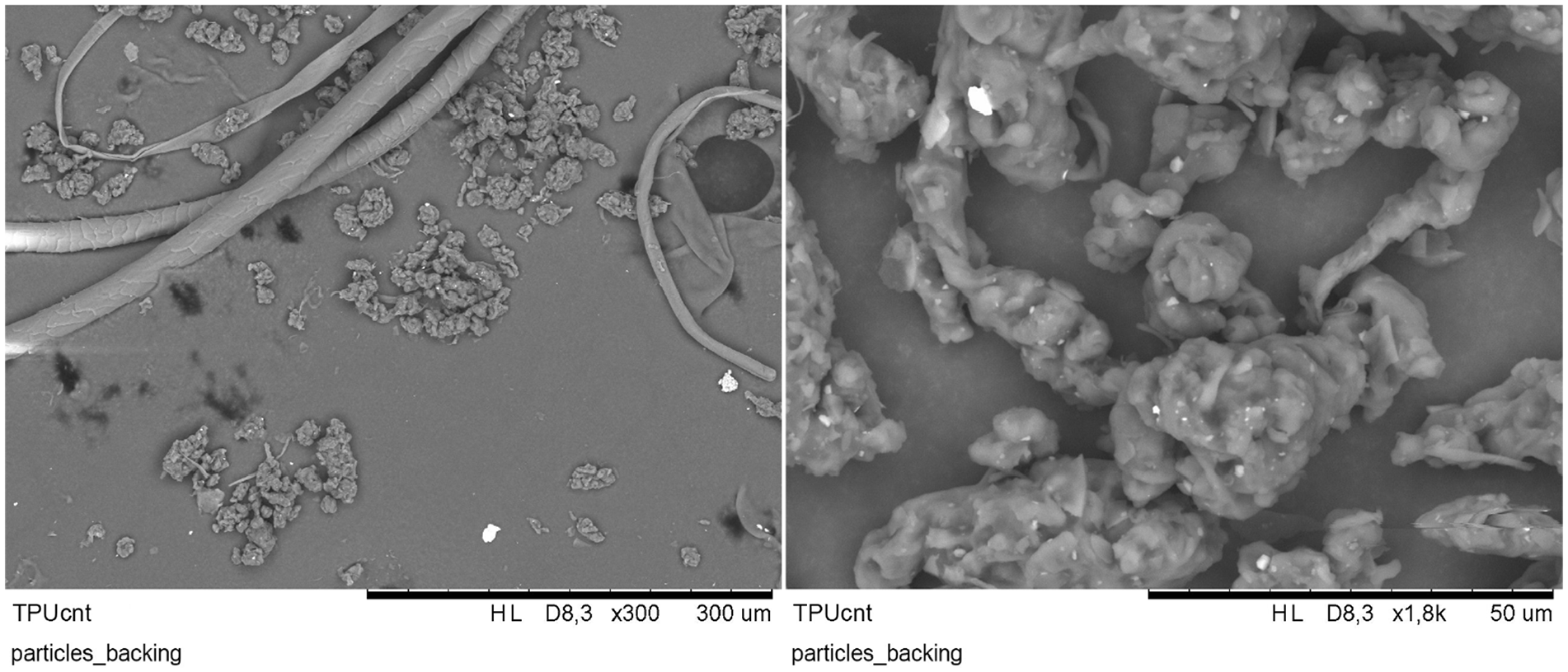 SEM pictures of particles shaken out of the backing felt (layer under abrasion fabric) of TPUcnt at different magnifications.