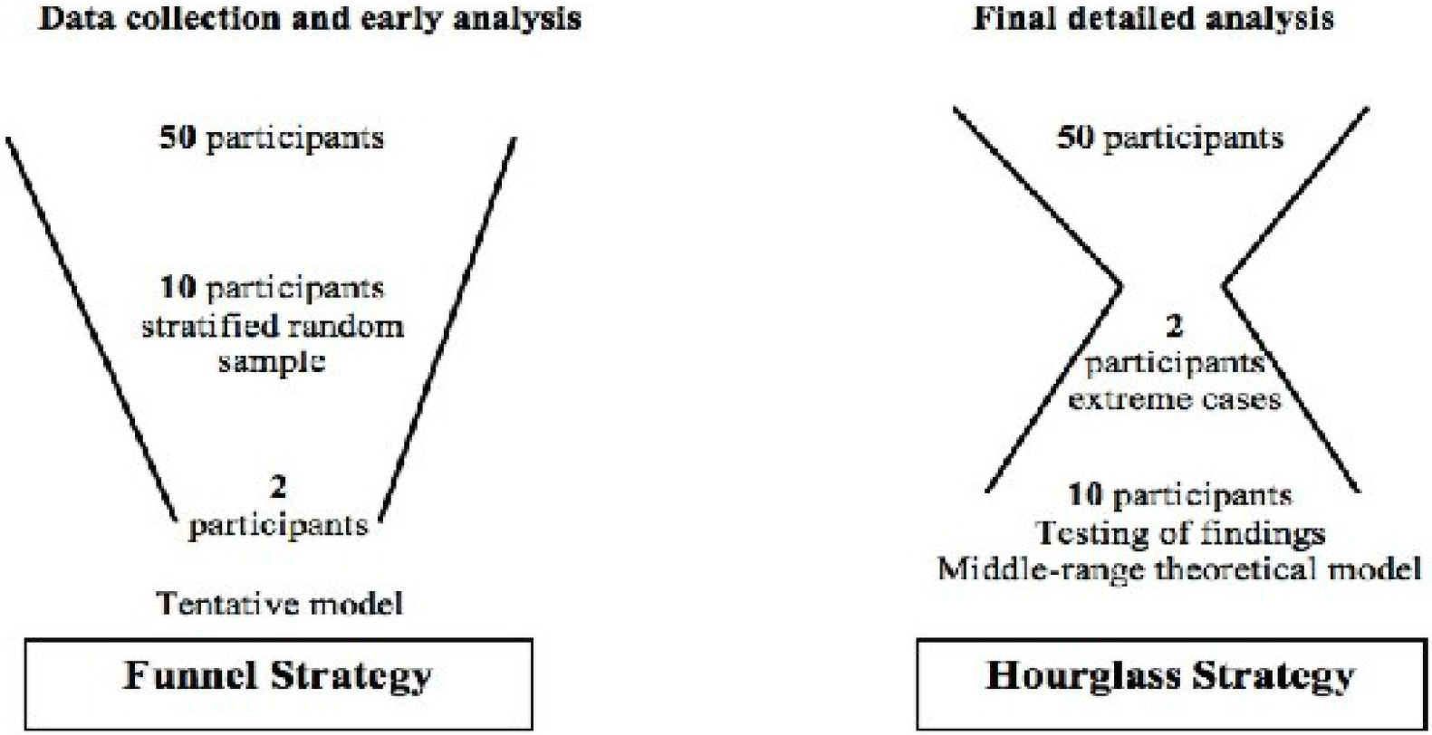 Why is this distinction between the funnel and the hourglass important? Beyond the increased transparency of declaring the methods employed, the distinction between the two strategies is critical, particularly in terms of credibility of findings. The funnel strategy is typical in qualitative and mixed methods studies for narrowing the number of participants and managing related data while maintaining integrity of the sample. However the hourglass strategy for analysis is not commonly described in the literature. As a researcher with few resources, I found that use of the hourglass strategy was manageable and effective.