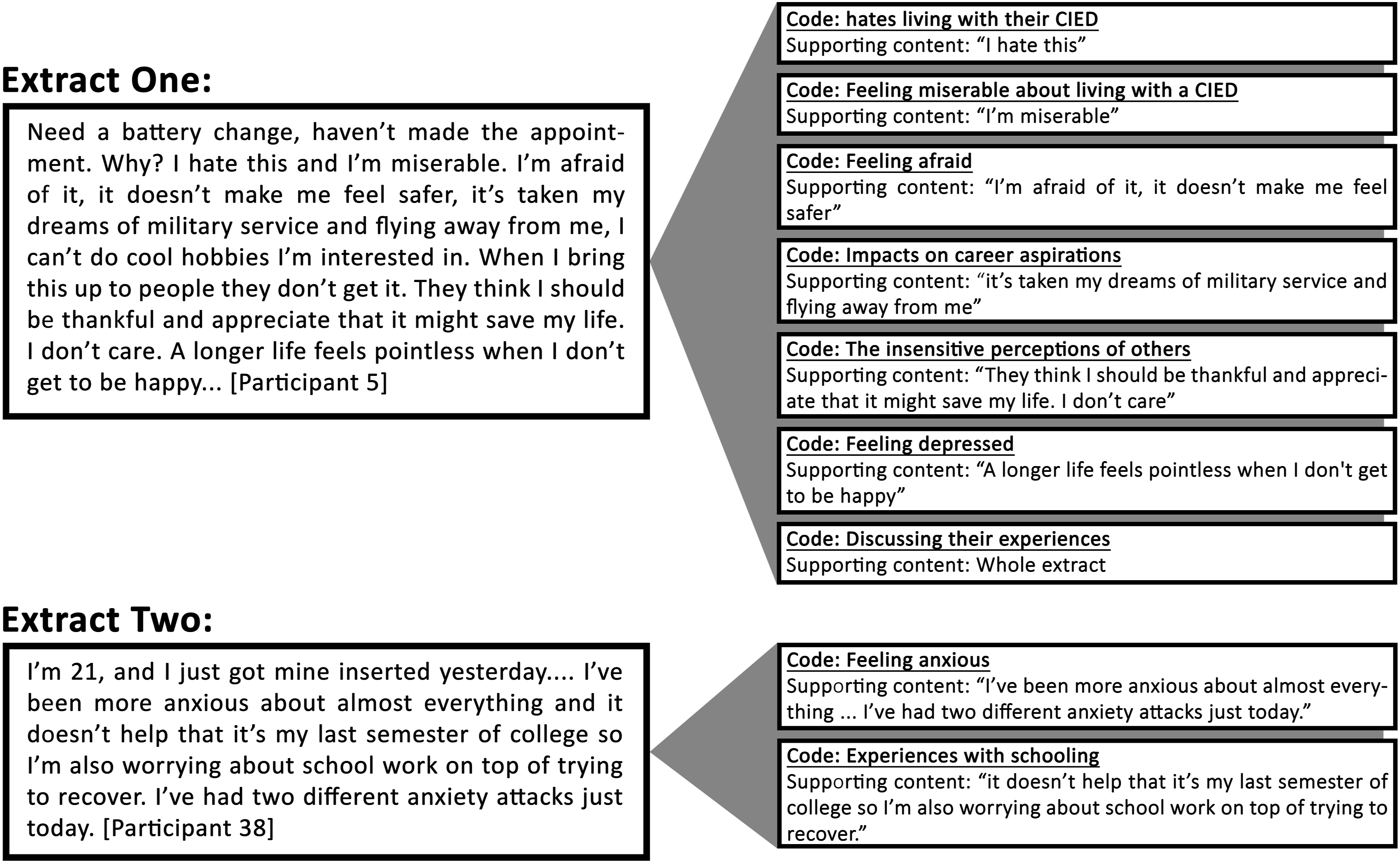 In order for codes to capture the richness of their original text, RCA takes a specific approach to coding and the construction of codes. Codes in RCA act as containers for recurring or singular pieces of text that are relevant to a research question. Codes are labelled using short self-defining sentences that are based on the manifest meanings of textual instances contained within each code. For example, the code “Feeling anxious about upcoming medical treatments” would capture all instances in which participants described their feelings of anxiety regarding their upcoming medical treatments. Using labels directly derived from the text allows RCA to reduce a dataset while capturing its original richness. Additionally, the self-definitional nature of these labels is intended to make it easier for the researcher analysing the data to work with a large volumes of codes.