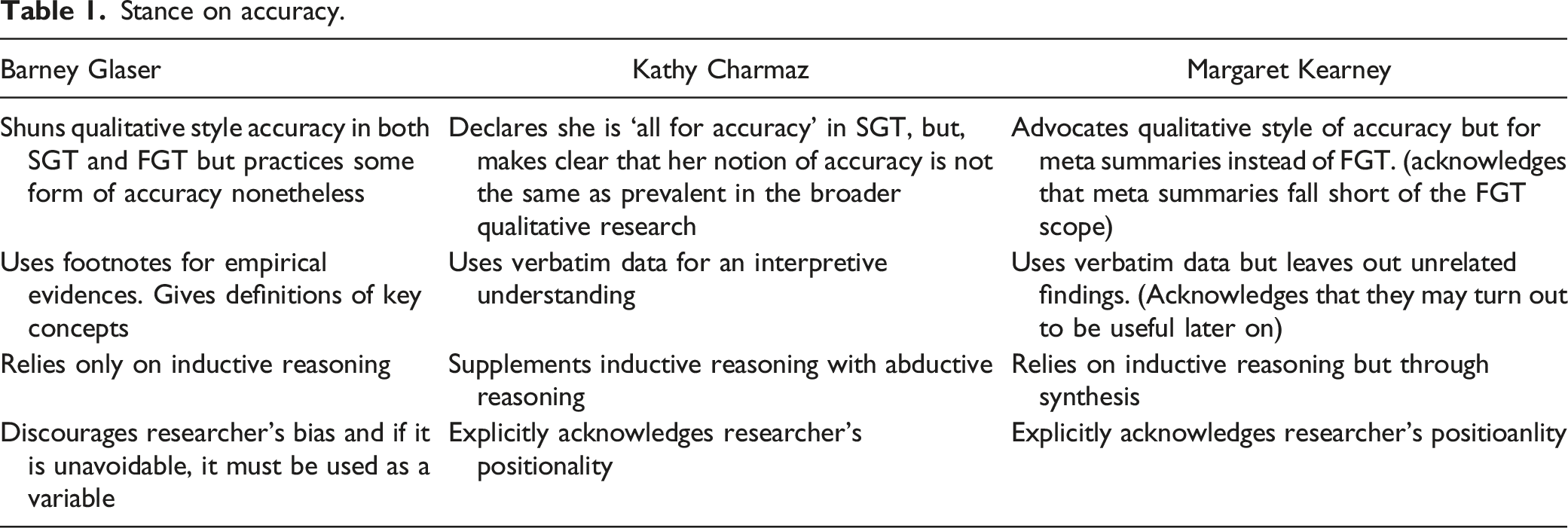 The title of this section is taken from an article by Glaser, 2007c, p. 125) who uses the term ‘worrisome accuracy’ extensively in his works to highlight the inappropriate level of importance conceded to accuracy in GTM (see for example, 2002, para 2; 2003, p. 130; 2004, para 4) which ultimately results in interference with the GTM conceptualization process; analyses with detailed accounts of empirical evidence, as mentioned elsewhere, form an essential quality of the QDA procedures. While Glaser problematizes the practice of accuracy in GTM, other grounded theorists like Charmaz and Kearney find value for the concept but their definitions fall short in practicalities. Below I analyze three formulations of accuracy, first Glaser, second Charmaz (2004; 2006; 2016) and third Kearney (1998; 2007, p. 167). Glaser dwells on the concept of accuracy in the context of both SGT (Gasson, 2003; Glaser, 2002a, 2002b and FGT (Glaser, 2007a, 2007b, 2007c without differentiating between the two levels. Charmaz comments mainly with respect to SGTs and Kearney FGT. I attempt to show that in the absence of a well-defined methodological guidance on how to use accuracy in FGT, there is a need for pragmatic accuracy that rests on the premise that accuracy is not an absolute but a product of construction, influenced by a researcher’s decisions.