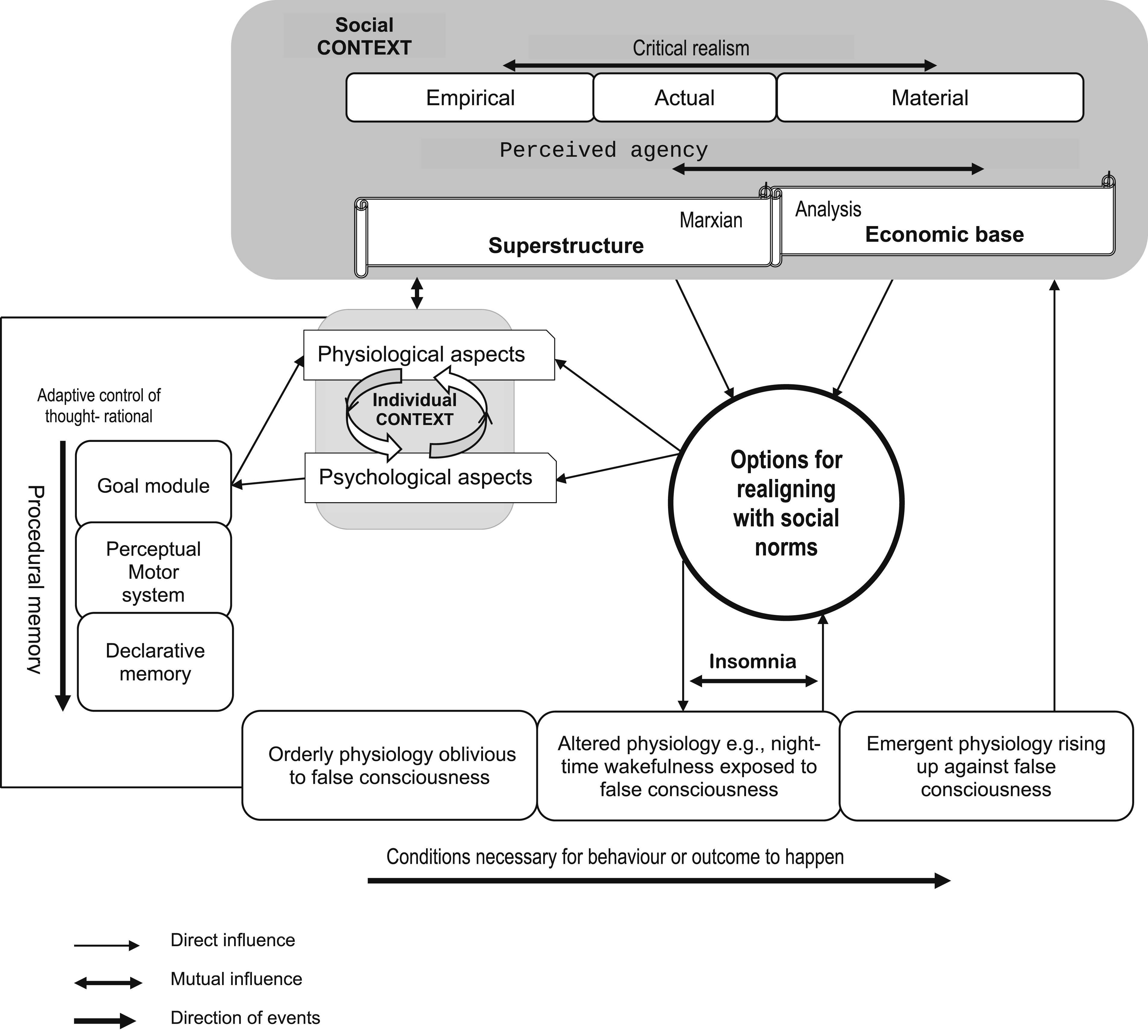 The conceptual framework integrates critical realism’s levels of reality, modules of the adaptive control of thought-rational, Marxian base-structure analysis, agency and structure, and the physical and psychological aspects of the individual in a social context.