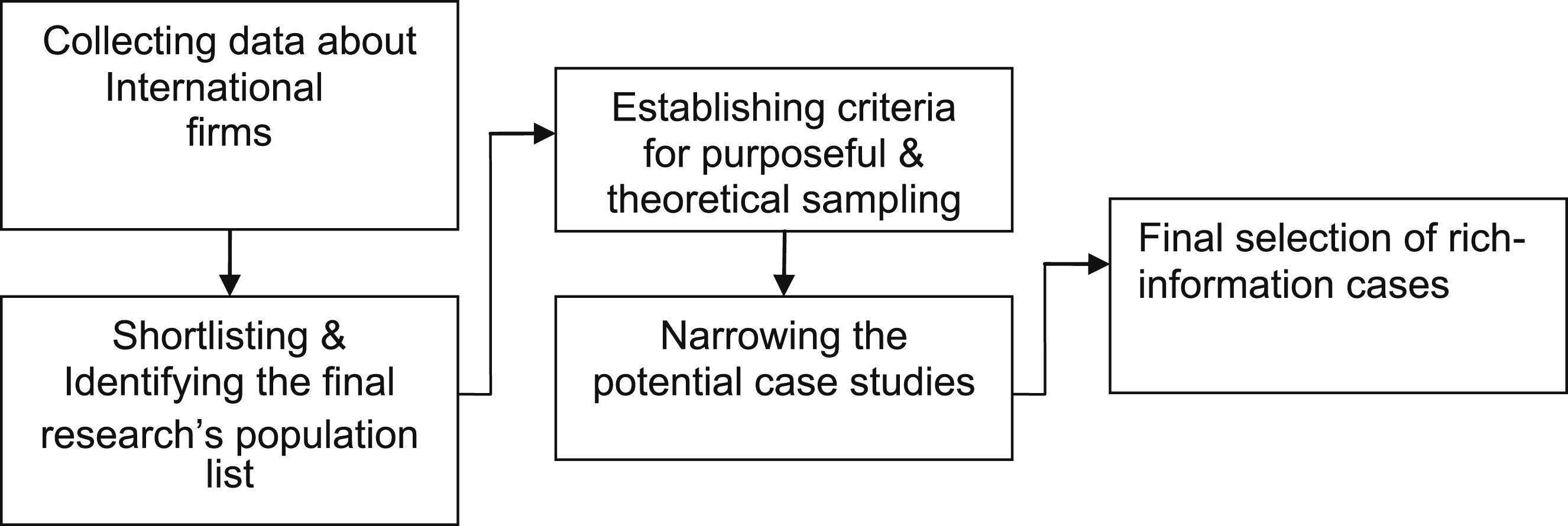 Experienced researchers have established common agreement which suggest strongly that the selection of case studies should be made based on “theoretical sampling” and not based on “random sampling” as is the case with survey research (Eisenhardt, 1989; Glaser & Strauss, 1967; Patton, 1990; Perry, 1998; Yin, 2003). According to Glaser and Strauss (1967, p. 45) theoretical sampling is “the process of data collection for generating theory whereby the analyst jointly collects, codes, and analyses his data and decides what data to collect next and where to find them, in order to develop his theory as it emerges”. Yin (2003, p. 47) argued strongly that multiple cases should be considered as multiple experiments and not multiple respondents in a survey and cases must be selected based on replication logic and not based on sampling logic. As a result, each case either predicts similar results (literal replication) or predicts opposite results for predicable reasons (theoretical replication).