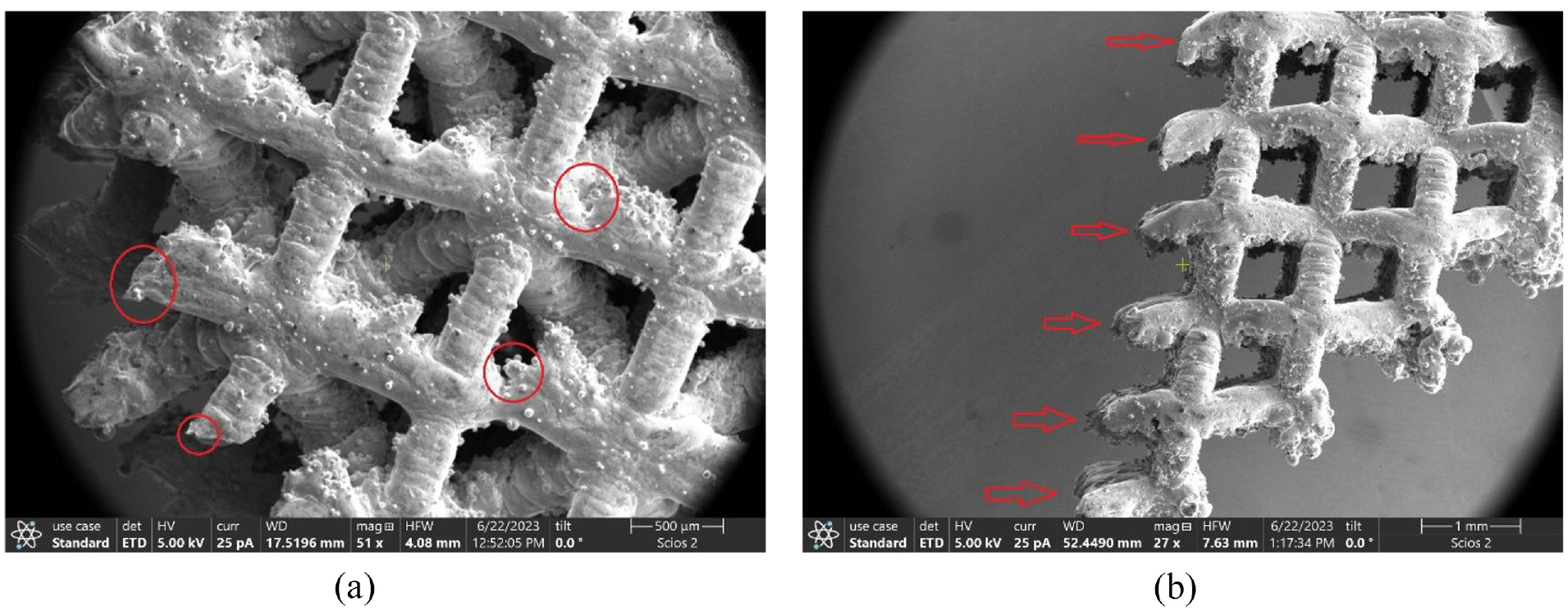 Fracture analysis SEM image of control group: (a) OT topology; (b) BCC topology.
