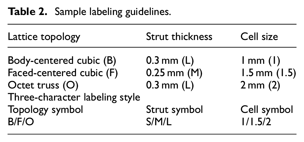The lattice geometry selected for this study are Body Centered Cubic (BCC), Face Centered Cubic (FCC), and Octet Trust (OT). The lattice structures were designed and printed in three different topologies, consisting of BCC, FCC, and OT. These lattice structures have been studied for different mechanical properties and applications.13–15 Moreover, Regarding the topologies of BCC, FCC, and OT were decided based on their compatibility with minimum build angle and their proven manufacturability.16–18 Table 2 provides the labeling guidelines for the structures and Figure 2 shows the specimens used for mechanical testing. Figure 2(a) shows the nTopology sample designed for tensile and compression testing. Each of the lattice samples were designed to have a unit cell size of 1, 1.5, and 2 mm, as shown in Figure 2(b). Two strut sizes were used of 0.25 mm denoting
