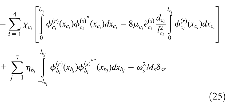 Equations (4) and (5) together with the boundary and matching conditions in equations (9)–(19) describe the nonlinear forced vibration of the cable-stayed bridge. The equations governing the small amplitude free vibration of the cable-stayed bridge can be obtained by linearizing equations (4)–(19) and neglecting the structural damping and external loadings in the neighborhood of the equilibrium configuration. The rth undamped natural frequency and its corresponding eigenfunction of the linearized cable-stayed bridge model can be numerically solved using the methodology in Cao et al.20 The rth undamped eigenfunction of the transverse vibration of the linearized cable-stayed bridge model can be expressed by , where and are the rth undamped eigenfunction of the transverse vibration of the stay cable ci and the segment bj of the deck beam, respectively.