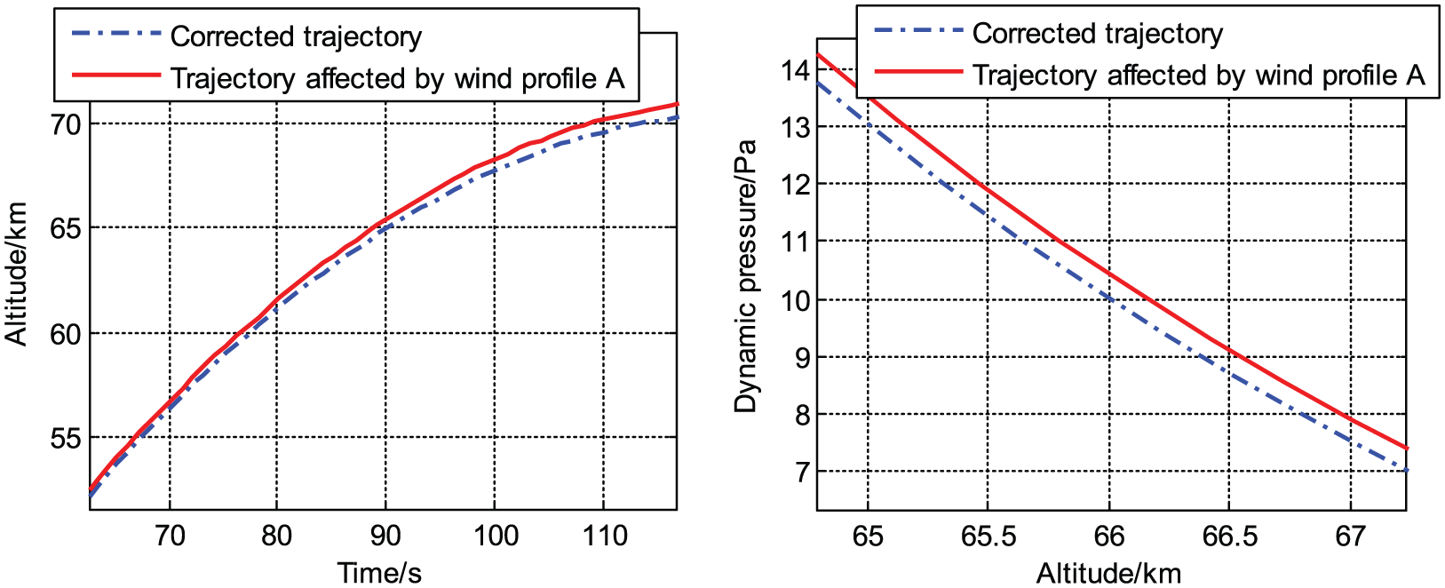 In Figure 10, the trajectory affected by wind met the separation dynamic pressure at 66.158 km. After wind compensation, the altitude was 66.004 km, with an error of 4 m to the predetermined altitude, and the program ran for 2 min. In Figure 11, the trajectory affected by wind met the separation dynamic pressure at 66.585 km. After wind compensation, the altitude was 65.989 km, with an error of 11 m to the predetermined altitude, and the program ran for 3 min. In Figure 12, after compensation, the altitude changed from 66.464 to 65.995 km, and the program ran for almost 3 min. All the simulations were performed on a personal computer with an Intel Core i5 processor and random access memory of 4 GB, which is common in most computers. From the simulation times, we determined that the wind compensation method is suitable for calculating launch parameters immediately prior to launch. Due to the use of wind weighting, we can obtain approximate ranges of the launch parameters, which shorten the wind compensation time significantly, and the pattern search method is used to obtain precise solutions. Through the simulations, we determined that the errors were almost within 10 m.