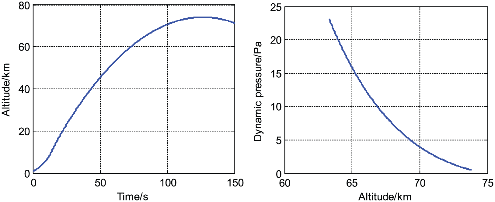 The free flight phase was then simulated for an elevation angle of 85°, as shown in Figure 8. From the figure, we can determine that the rocket can fly smoothly to a height of more than 70 km; the dynamic pressures at 64 and 67 km are 20 and 10 Pa, respectively. The deployment of the parachute can be successfully completed in a near-space environment detection mission. Considering the sinking angle and sinking angle velocity, through the trajectory simulation, we can determine that although the sinking angle and sinking angle velocity are tiny compared to the elevation angle, the sinking angle and sinking angle velocity can be ignored only for simulations using large elevation angles close to 90°.